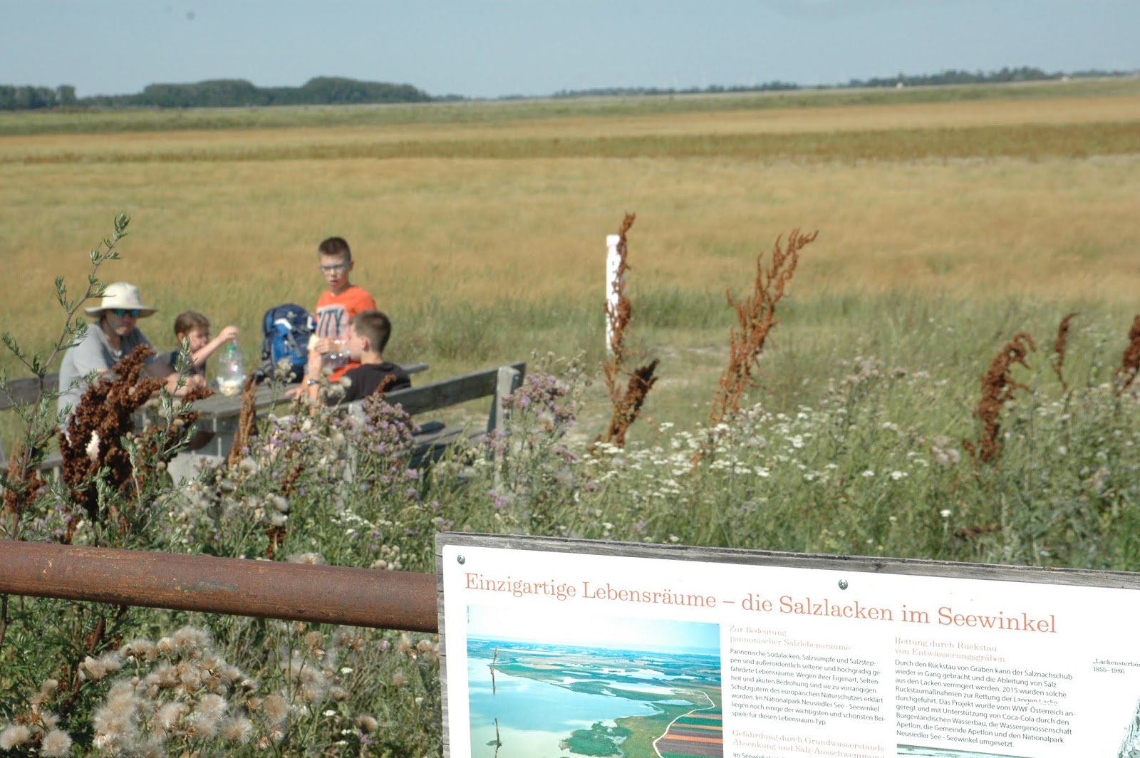 Az egészen biztos volt, hogy ha már ezen a vidéken nyaralunk, a Seewinkel, azaz magyarul a Fertőzug környékét mindenképpen szeretnénk alaposan megismerni, bejárni. Ez a Fertő-Hanság Nemzeti Park osztrák szakasza, tehát rendkívül értékes terület. Két napot szántunk végül erre, az elsőt pedig a látogatóközpont felkeresésével kezdtük – abból baj nem lehet, hogy a nemzeti park helyi központjából minden infót beszerzünk, amit csak tudunk. Ráadásul itt jó nagy a parkoló, úgy tudtunk tehát megállni nem kicsi vontatványunkkal, hogy senkit nem zavartunk vele. Mosdóügyek és a biciklik lepakolása után végre útnak indultunk. A nap sajnos melegnek ígérkezett, így minden adandó alkalommal megálltunk pihenni.