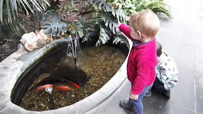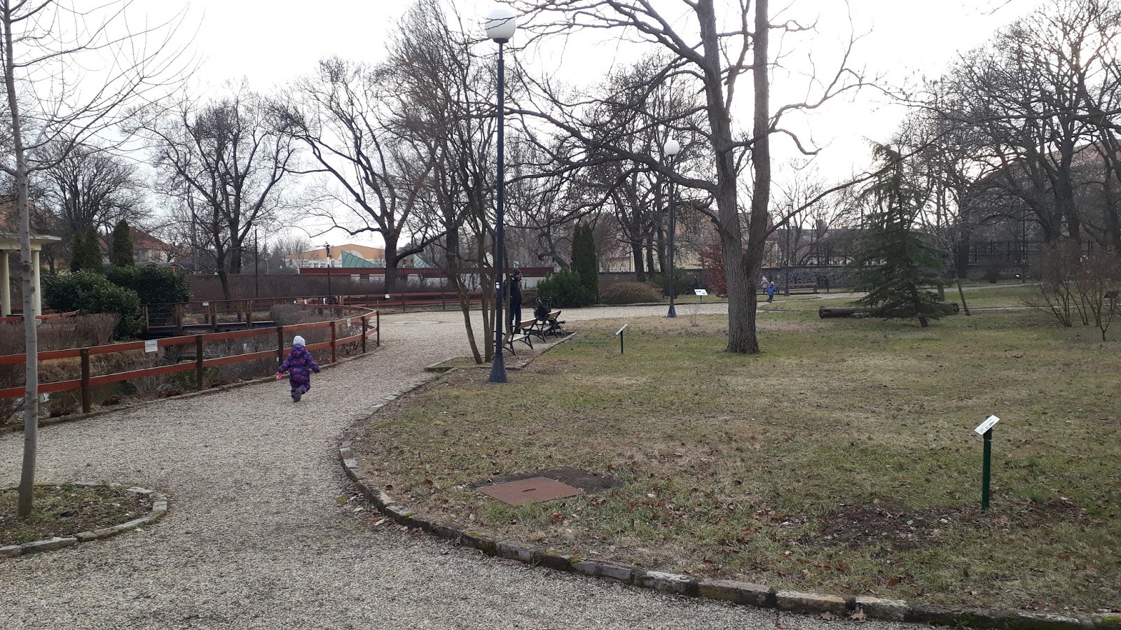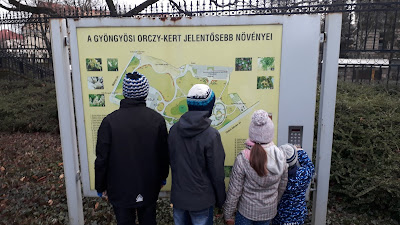 A kertben aztán jól kiszaladgáltuk magunkat, a pálmaházi meleg után kifejezetten jól esett mindannyiunknak az ébredező tavaszi időjárásban kint kiszellőztetni a fejünket. (Figyelem! Ott jártunkkor a teljes játszótér le volt zárva!!!) Hendikepes futóverseny (a leglassabban futó indult először és a leggyorsabb utoljára), madarak és a tavacskában lakó, rajokban úszó halak megfigyelése, és békés, nyugodt uzsonnázgatás – ennyi maradt hátra indulás előtt, ennyi fért egy félnapos kirándulásba. Este Apának már kimenős programja volt, ami miatt igyekezni kellett haza.