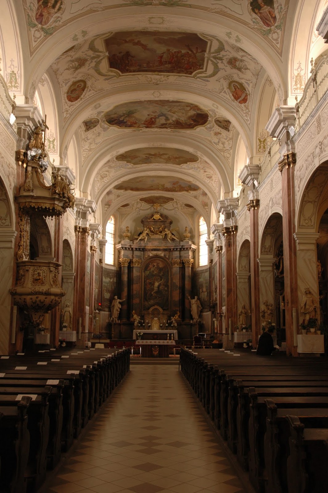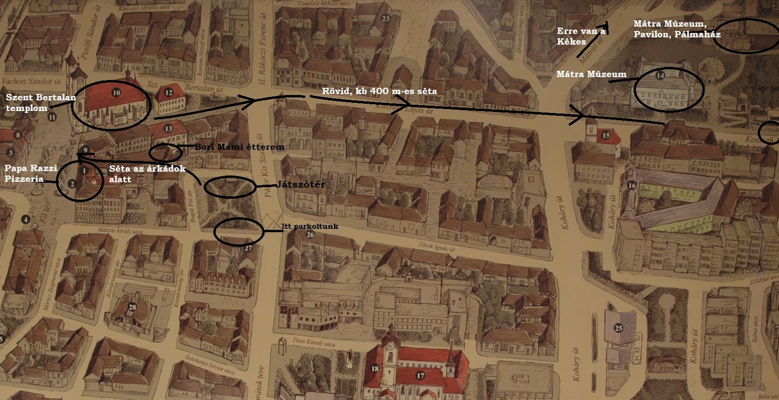 Hogy kicsit legyalogoljuk a bevitt kalóriákat, sétára indultunk. Elsőként a Szent Bertalan templomot vettük célba, szerencsére nyitva találtuk. Belépve egy kedves idős úr fogadott minket, s máris elkezdett érdekességeket mesélni a több száz éves barokk templomról. Látta, hogy a gyerekek nem fognak sokat bírni, ezért próbált olyan dolgokat említeni, amik őket is lekötik, pl. hogy 1917-ben a nagy városi tűzvészben a templom is leégett, és IV. Károly király és Zita királyné segítségével épült újjá. Juhász László, Laci bácsi, aki magát templomszolgának hívja, ő vezetett körbe, ezúton is hálásak vagyunk neki. Nem maradtunk sokáig, egyrészt mert hideg volt, másrészt mert ígértük a gyerekeknek a Mátra Múzeumot. Pedig ajánlgatta ő a Kincstárat, de úgy éreztük, ha ellőjük a “jól viselkedünk, mert múzeumban vagyunk” munícióinkat a Kincstárban, már semmi nem marad a Mátra Múzeumra.