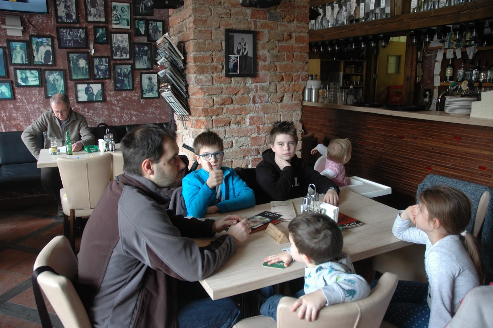 A játszózás után pontosan fél egykor beléptünk a Papa Razzi Pizzéria ajtaján. Foglaltam ugyan asztalt hét főre (férjem szólt, hogy hangsúlyozzam ki: mai napra, hetes főre 😀 ), mert nem tudtam, mennyire lesz tömött a hely, de fél egykor rajtunk kívül csupán egy úr ücsörgött. Később jöttek más vendégek, és folyamatosan jött-ment a rendelős futár, szóval elég népszerű helynek tűnt. Érdekessége, hogy a falakon paparazzi fotók sorakoznak, szépen bekeretezve, amerikai sztárokról, beterítve a gyönyörű, boltíves helyiség összes falán lévő összes szabad felületet. Vicces körbenézni! Ami viszont nekünk most nagyon kapóra jött: 3 nagyképernyős tévén ment a sportközvetítés a síugró világkupáról, ami annyira lekötötte az izgága, de sportszerető gyerekeimet, hogy egész nyugodtan tudtuk kivárni a pizzák érkezését! A pizzák finomak voltak, minden rendben volt velük, máskor is választanánk ezt a kis pizzériát – ami nyáron, ha jól sejtem, többszörösére növeli a helyét és kapacitását, kitelepedve a Fő térre.