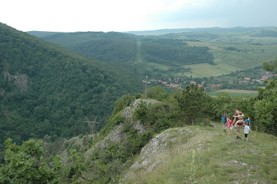 Egyébként igaza lesz. Bár végig borús az idő, és úgy dörög, mintha a szomszéd hegytetőről jönne a hang, valóban messzebb van az, csak a szelét érezzük. Amint megérkezünk a Kalica-tetőre, új pikniktakarónkat kibontva enni kezdünk. Mindenki éhes és szomjas. A hideg ebéd jól esik, a szél azonban egyre jobban fúj és a dörgések is, mintha közelebbről szólnának… a gyerekeknek nem engedjük, hogy kimenjenek a sziklák peremére, még így is félelmetes, hogy messzebb állunk a szélétől: hatalmas a mélység lefelé.. Látszik, melyik úton jöttünk, részben látszik az Upponyi-szoros is. A kilátás egyszerűen lenyűgöző. Kár, hogy nincs idő csodálni. Szemerkélni kezd, aztán abba is hagyja, de ez éppen elég ahhoz, hogy megugrasszon minket, és komolyan vegyünk végre: indulnunk kell lefelé!