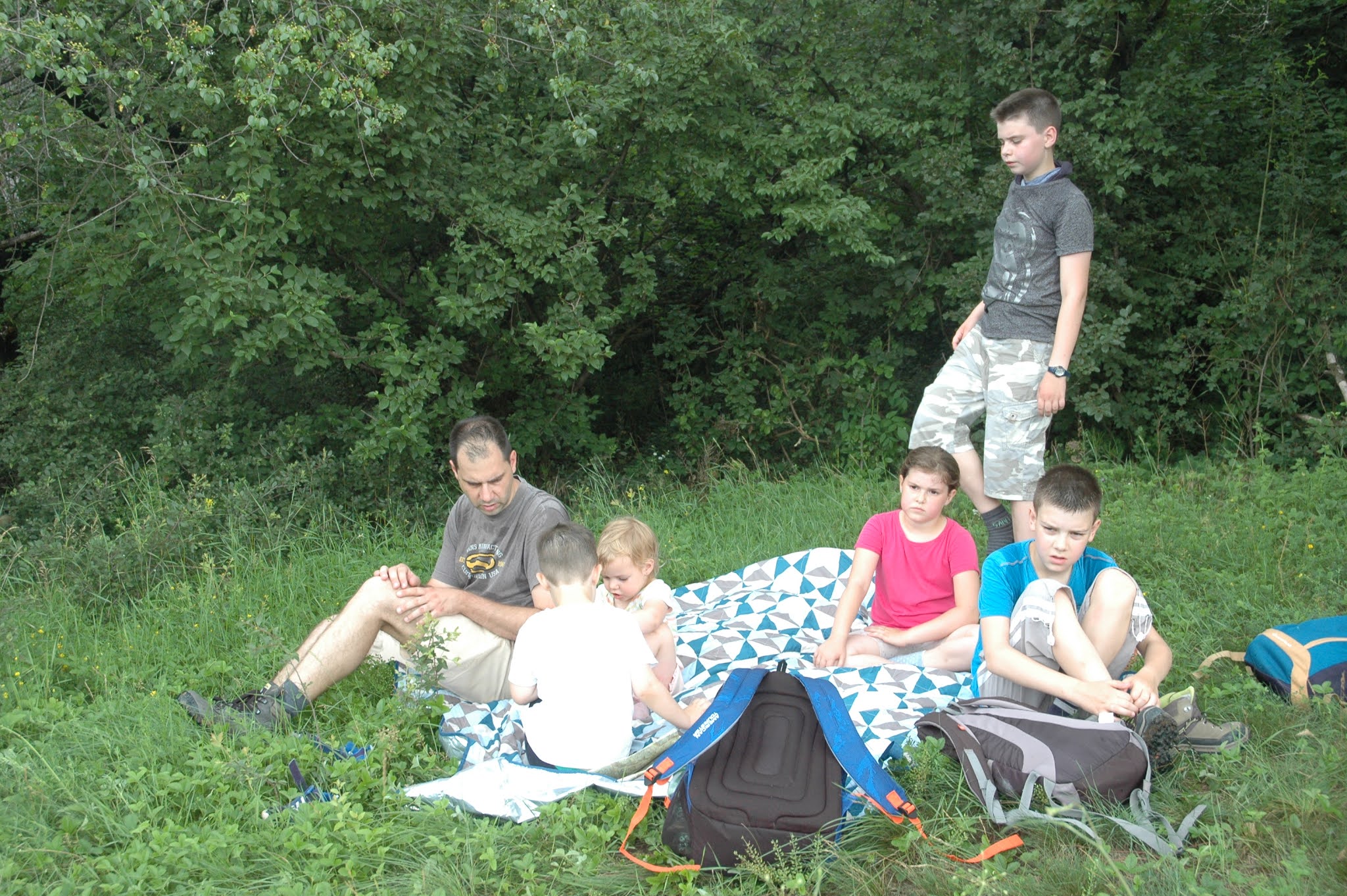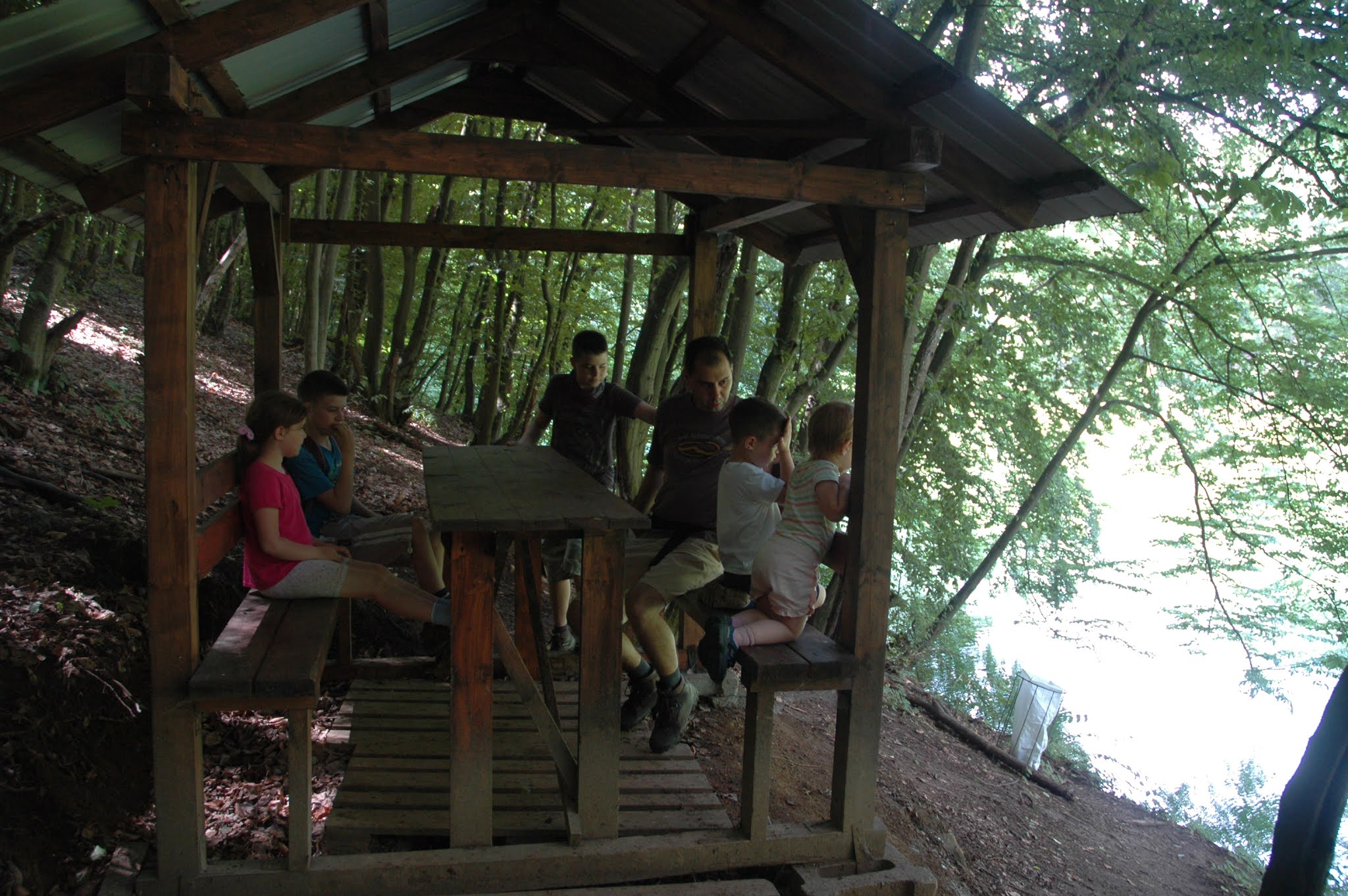 | Uzsonna a horgászpihenőben. A lejtő meredek, a kicsikre vigyázni kell! |