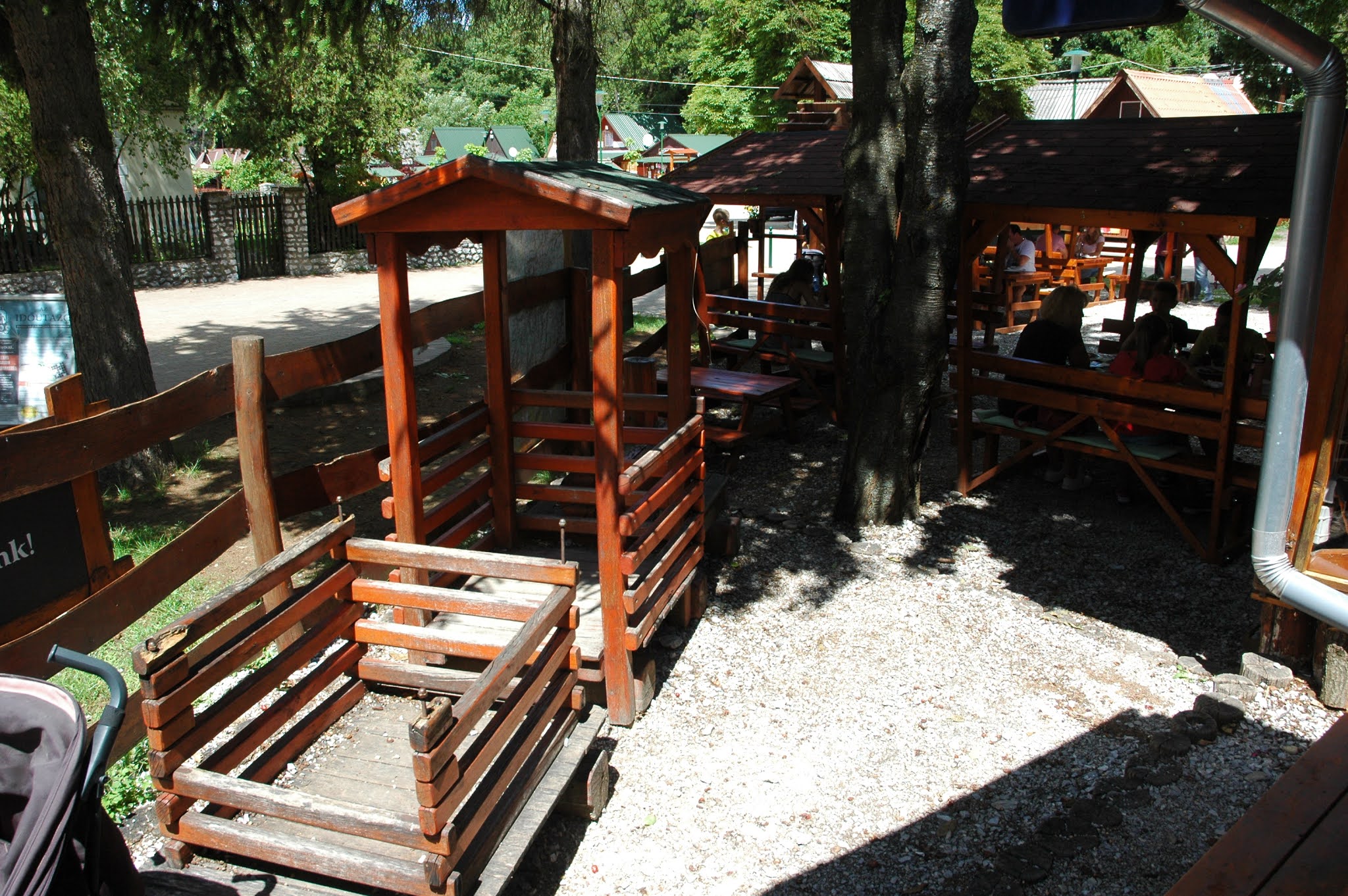 Jól van, már a szépen lekövezett, kulturált sétányon gyaloglunk, és van egy csomó nyitott kajálda. Nem fogunk éhenhalni. A fiúk kezdenek megnyugodni, hiszen már csak választani kell. Elmegyünk a kisvasút indulási pontjáig, itt pillantjuk meg a Lokomotív Étterem-Pizzériát. Leülünk egy asztalhoz, ahonnan mind a kisvasút, mind a pénztár jól látható. Nagyszerű! Eszünk, és közben figyeljük a dolgok állását! Kell ennél több? Igen, nekem pl. jó lett volna, ha a házi limonádét nem önti ki valamelyik az első pillanatban, ahogy megkapta, ráadásul a fényképezőnk mellett 1 cm-rel. Domestos törlőkendő, hát te mire vagy a táskámban mindig? Na, pont az ilyenek miatt… most is használtam, áldottam az eszem, hogy beraktam. (A Betadine a másik ilyen állandó tárgy, ami velem van, ha gyerekekkel megyünk valahová, azt is gyakran kapom elő, ja és persze a mindenre is jó popsitörlő-kendőt…)