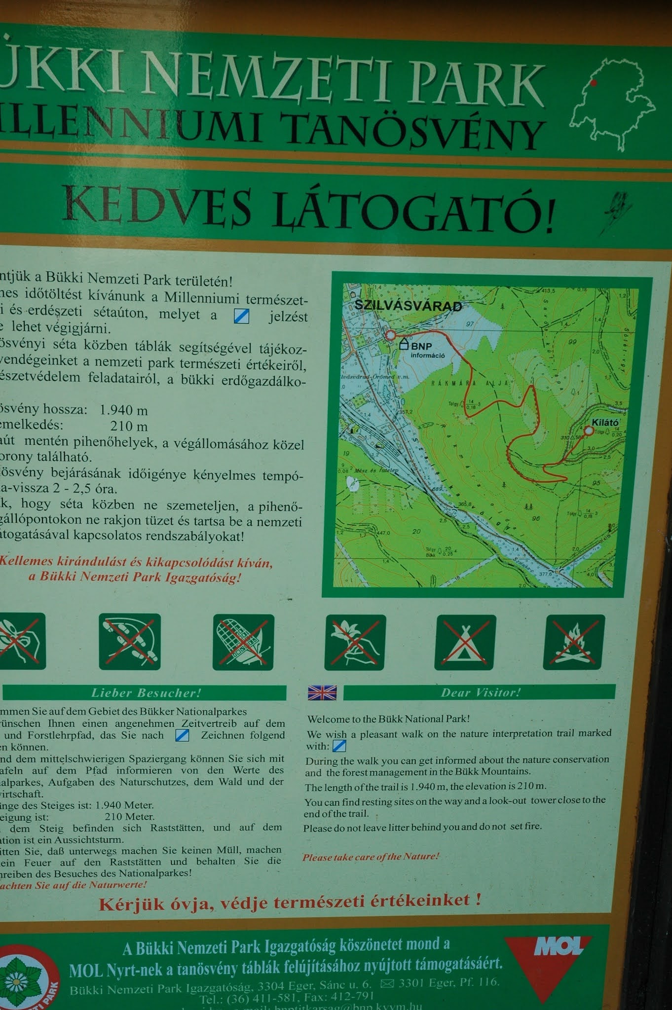 Kifejezetten meglepő volt szembesülni azzal a kellemes ténnyel, hogy a járványhelyzet miatt Szilvásváradon kifogtuk az utolsó napot, amikor még nem kell parkolódíjat fizetni. Éljen, éljen! Mekkora mázli! Korán érkeztünk, 9.30 körül ember nem volt még rajtunk kívül a parkolóban. Innen azonnal hegynek vettük az irányt, hogy az aznapra tervezett első komolyabb kihívást még a déli órák előtt teljesítsük. A Millenniumi-kilátóba terveztünk eljutni, gyalog. Egy kellemes tanösvény vezet felfelé, szép tájékoztató táblákkal.