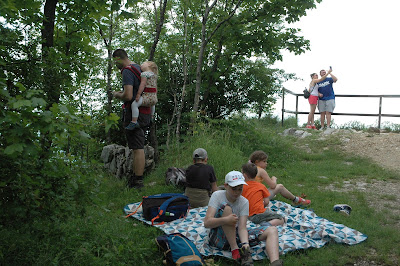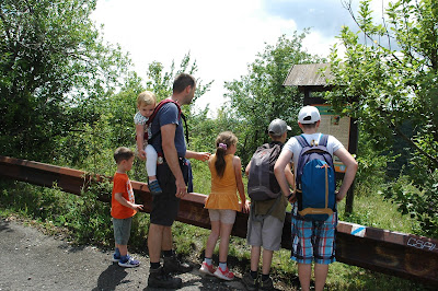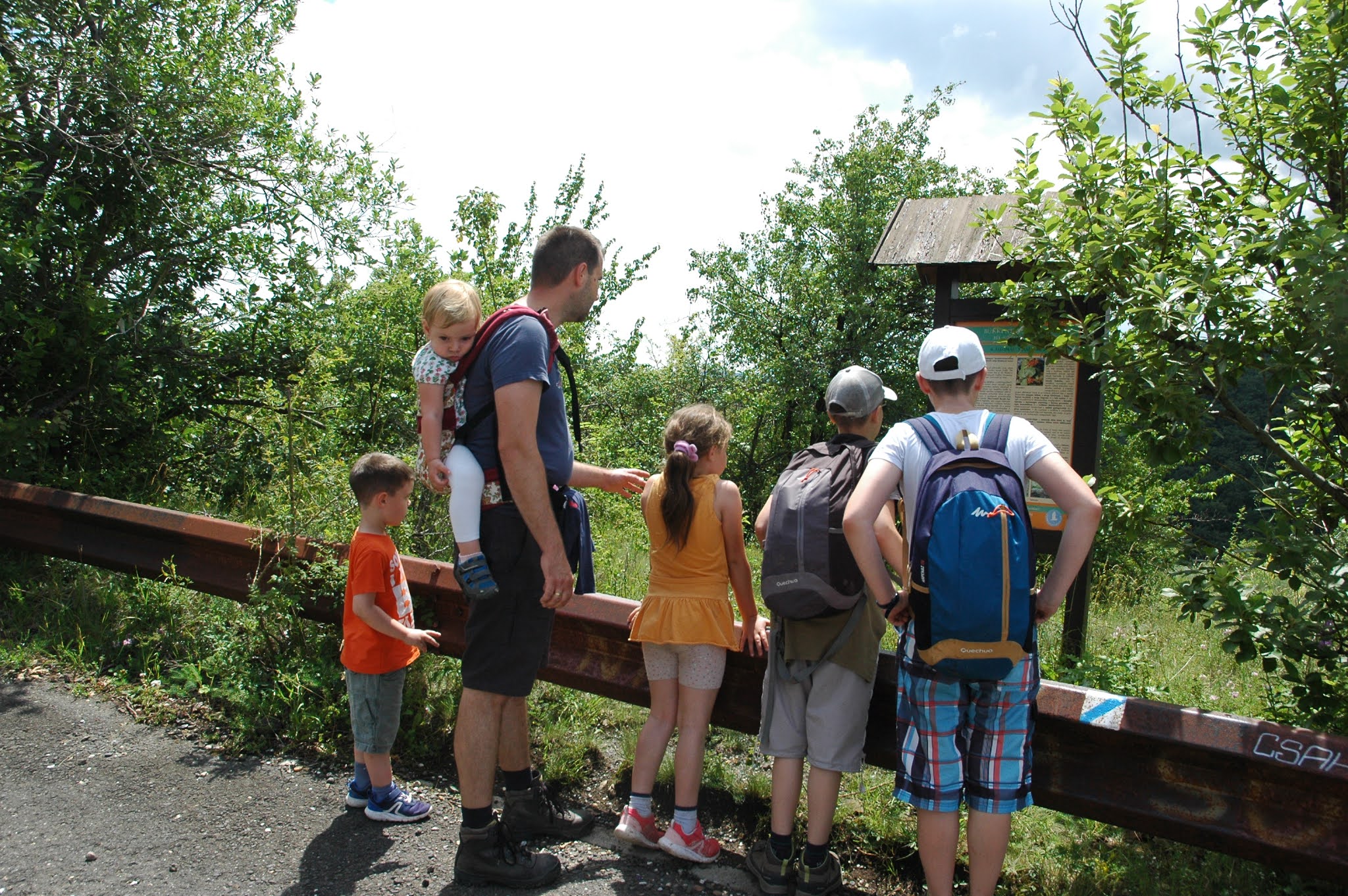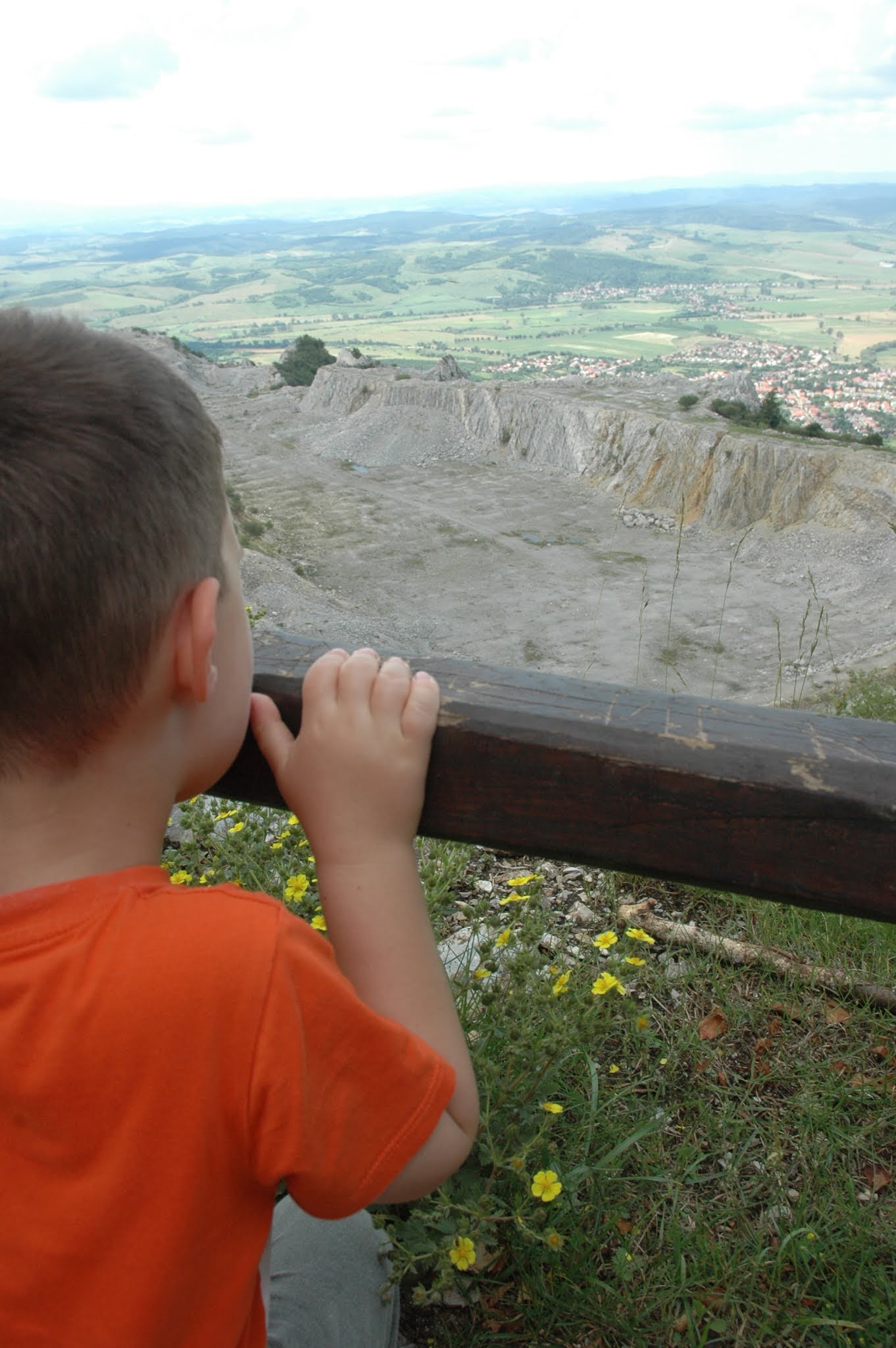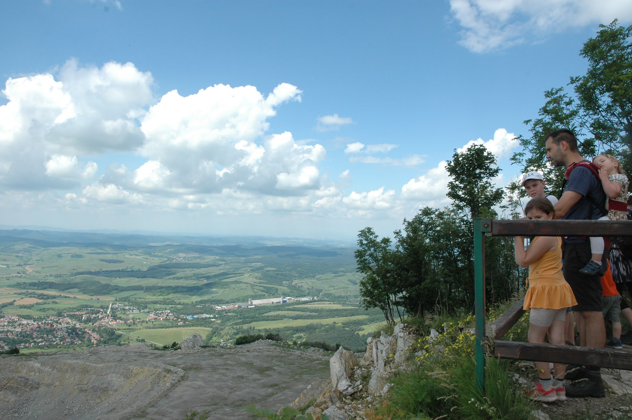 Néhány lelkes kiránduló a bányába is lement, mi ezt kihagytuk a fáradt gyerekekkel. Egyébként a bánya méretei egyenesen döbbenetesek. Csak véletlenül vettük észre fentről, hogy azok a mozgó kis rovar-izék valójában emberek!! A kilátás csodálása után lelkesen nekiálltunk ebédelni. Több kedves túrázó szóba elegyedett velünk – a gyerekeink száma láttán ez nagyon gyakran elő szokott fordulni. Olyan is volt már, hogy valaki megismert minket a blog miatt. Ezúttal egy kedves idősebb, de nagyon aktív kutyás házaspárral beszélgettünk hosszabban.