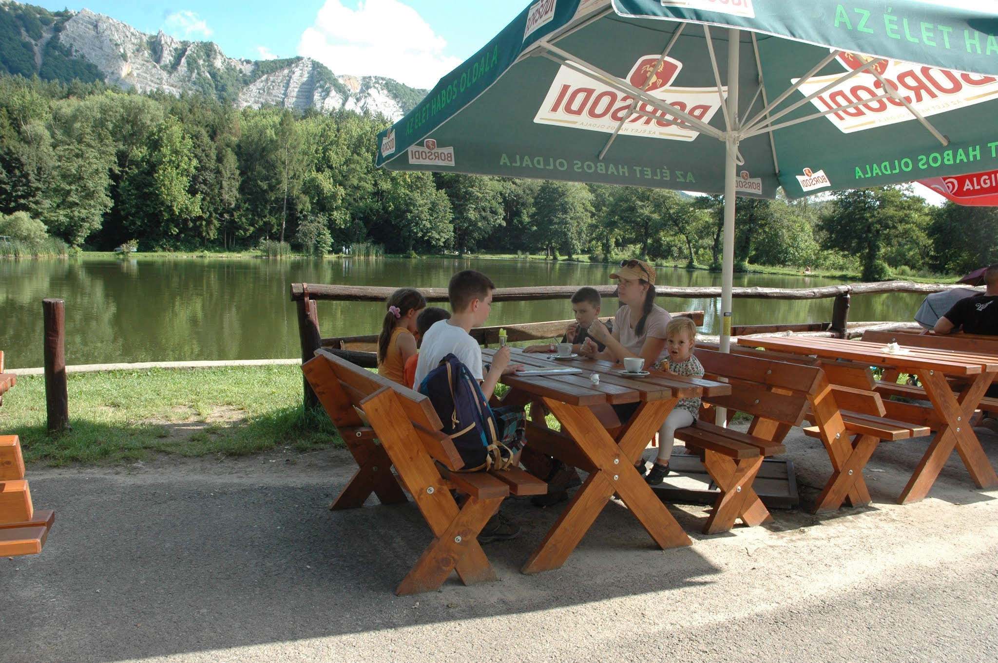 | Kávézás, jégkrémezés a Lak-völgyi tó partján. |