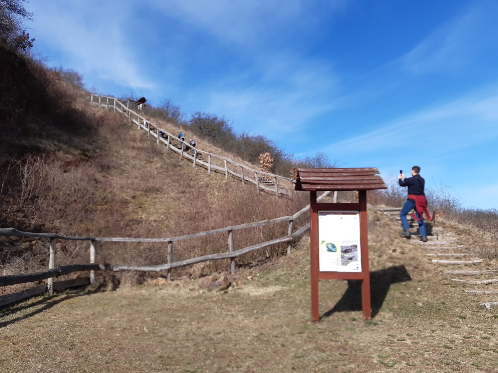 Apró félreértés volt, mert azt hittük, a tanösvény folytatása lesz az a turistaút, amelyen majd a várhoz tudunk felmenni, de hamar kiderült, hogy ezt rosszul gondoltuk (itthon láttam, hogy lehetett volna úgy is menni, kis kerülővel a domb oldalában a meredek lépcsőn lemenni, aztán vissza fel). Mindig hálás vagyok ilyenkor a Természetjáró App fejlesztőinek, ugyanis a tévedésünkből az okostelefon és az app segítségével korrigáltuk magunkat a helyes irányba (A Mátra térképemen ez a rész nagyon pici.). Szóval a helyes ösvény a falutábla előtti kis utcán felfelé haladva érhető el, a szokásos “vár turistajelzés” (kék L) is itt látható egy oszlopra festve.