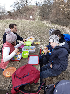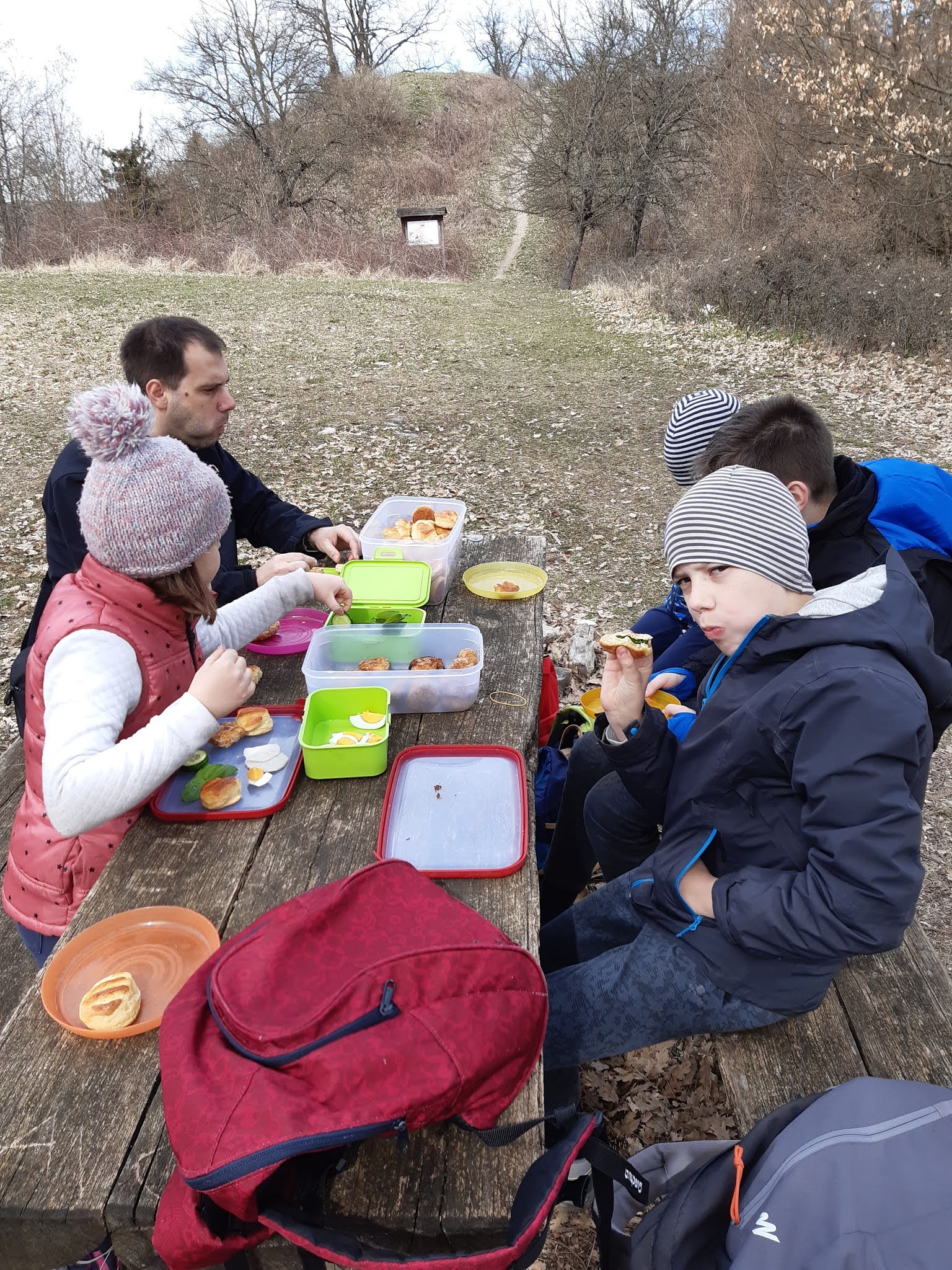 A csúcson egy asztalnál kiraktuk kis elemózsiánkat, amit ezúttal Nagyinak köszönhettünk: fasírtot és krumplis pogit kaptunk tőle, ha már találkozni nem igazán tudunk… Sokszor kérdezik, miket viszünk ilyen kirándulások alkalmával magunkkal: a szendvicseken túl nagyon bevált nekünk a fasírt-keménytojás kombináció sok előre felvágott zöldséggel. A gyerekek szeretik, laktat, teljes értékű ebéd és könnyen csomagolható, dobozolható. (A fasírtot sütőben sütjük ki, így nem csöpög a zsiradéktól és nagyságrendekkel gyorsabb is ilyen módon az elkészítése.)