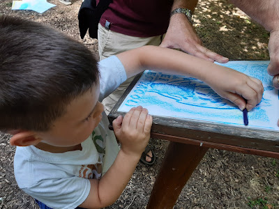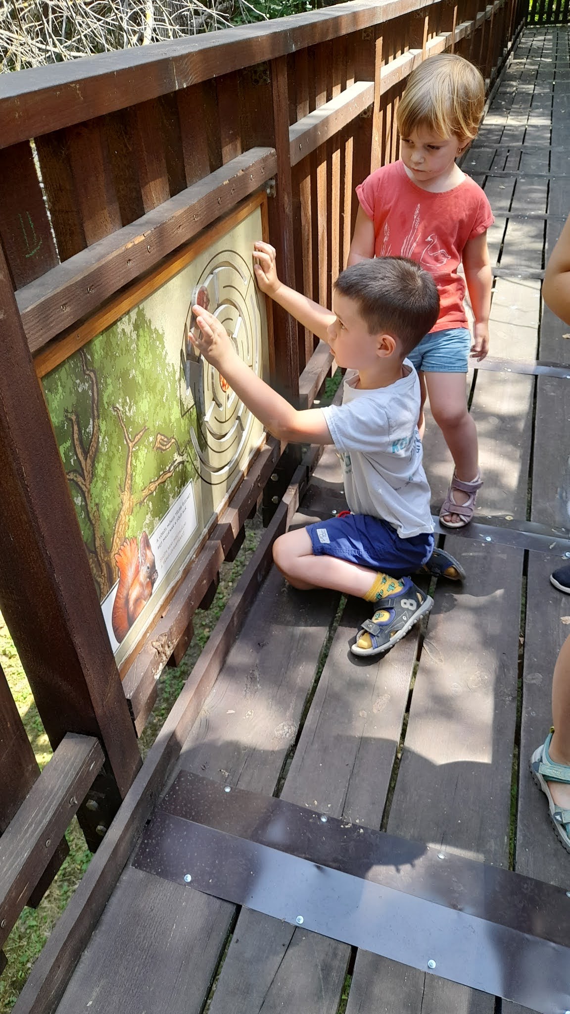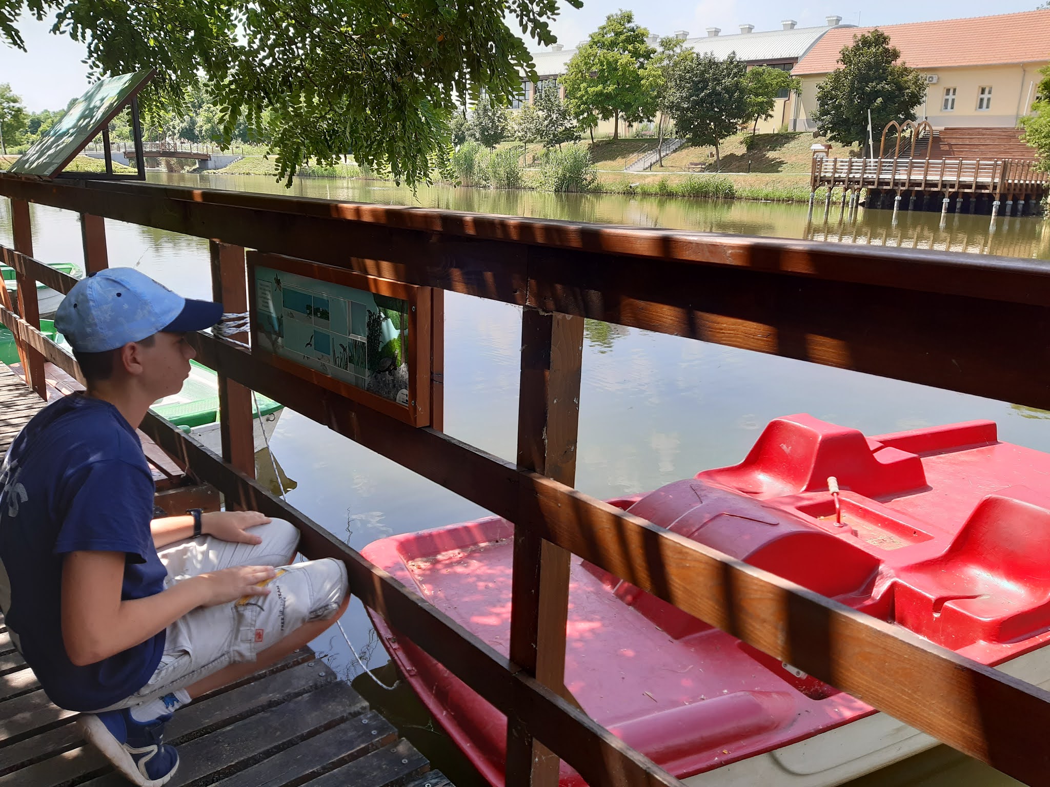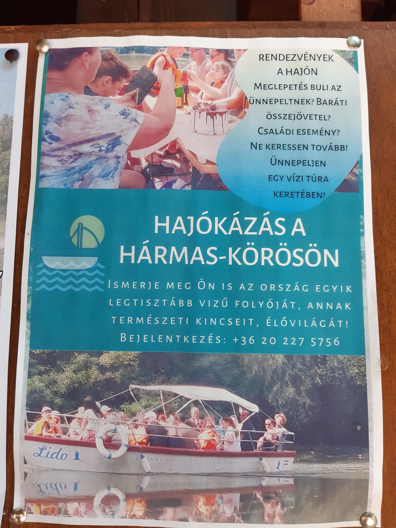 A sétány nem hosszú, néhány száz méter, de vannak rajta feladatok, olvasnivalók. A kilátót is meg kell mászni. Plusz a vízparton van egy stég, külön táblával. Hátul, a bódé mögött további játékok várják a gyerekeket, érdemes papírt és zsírkrétát kérni a hölgytől, mert gyönyörű satíroznivalók sorakoznak. A jegypénztárnál láttam a kiírást, hogy kit hívhatok, ha hajókázni szeretnénk. Tárcsáztam, és kiderült, utolsó esélyem aznap, ha 1 órán belül ott vagyunk a híd lábánál, mert Zsolt, a hajó és a kemping tulajdonosa később már nem fog ráérni, hogy elvigyen minket egy egyórás körre a Körösön.