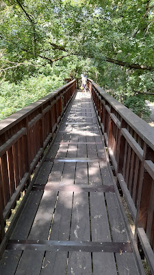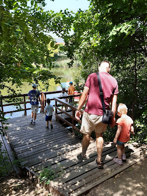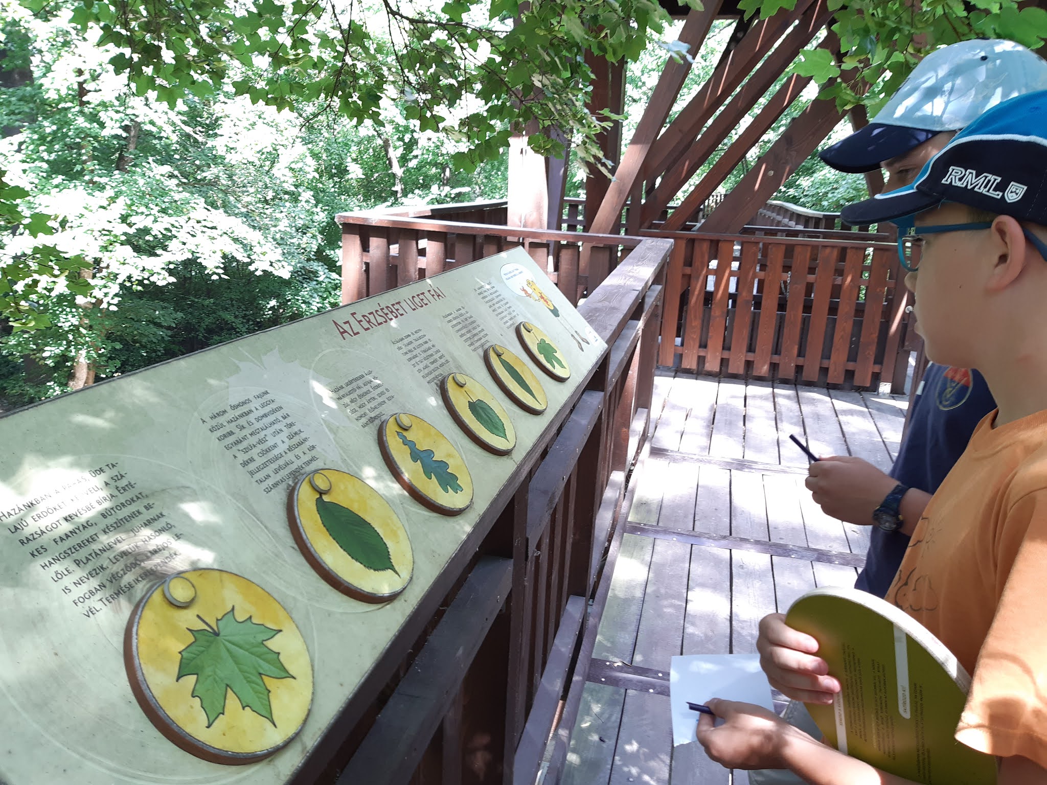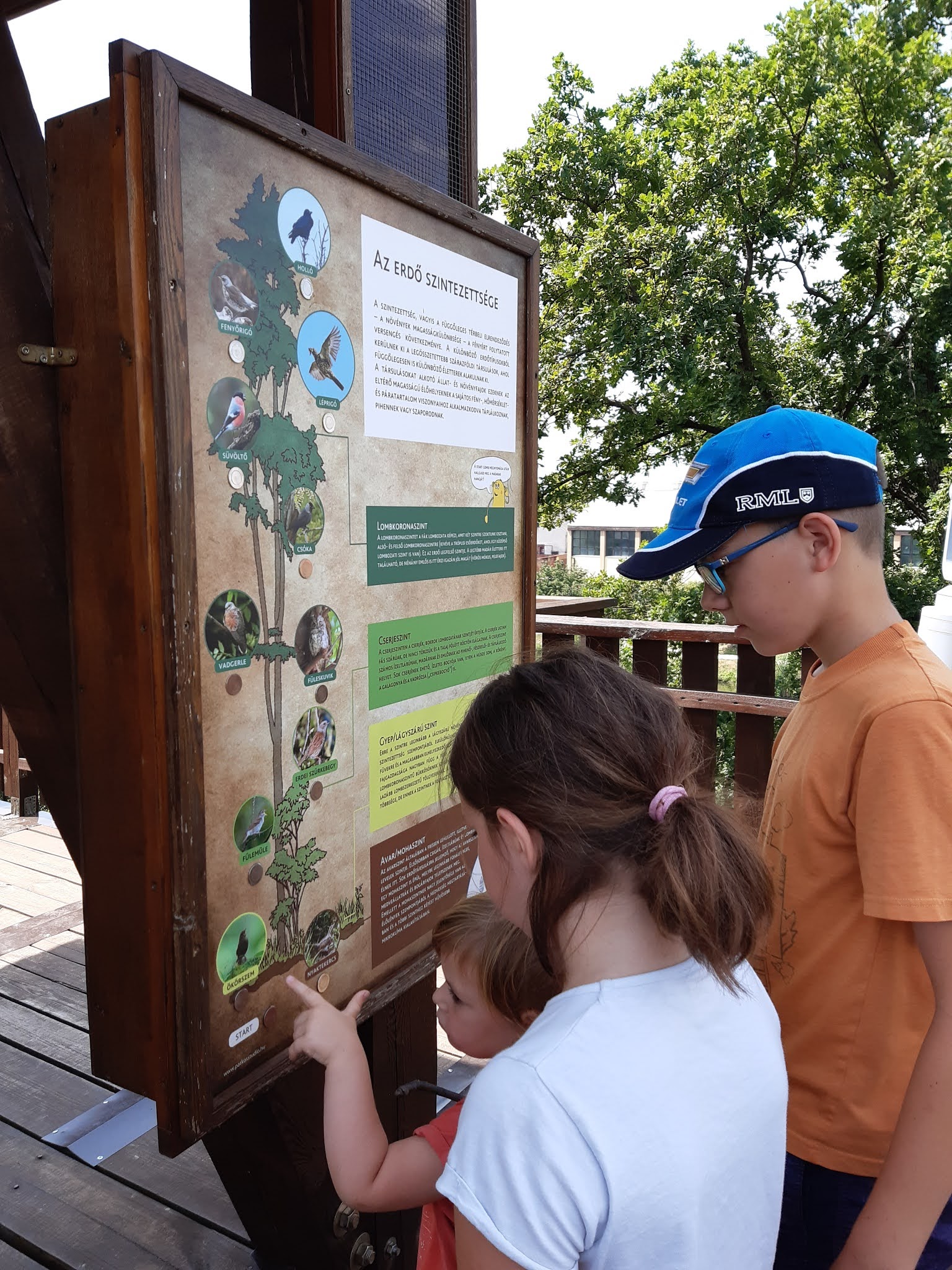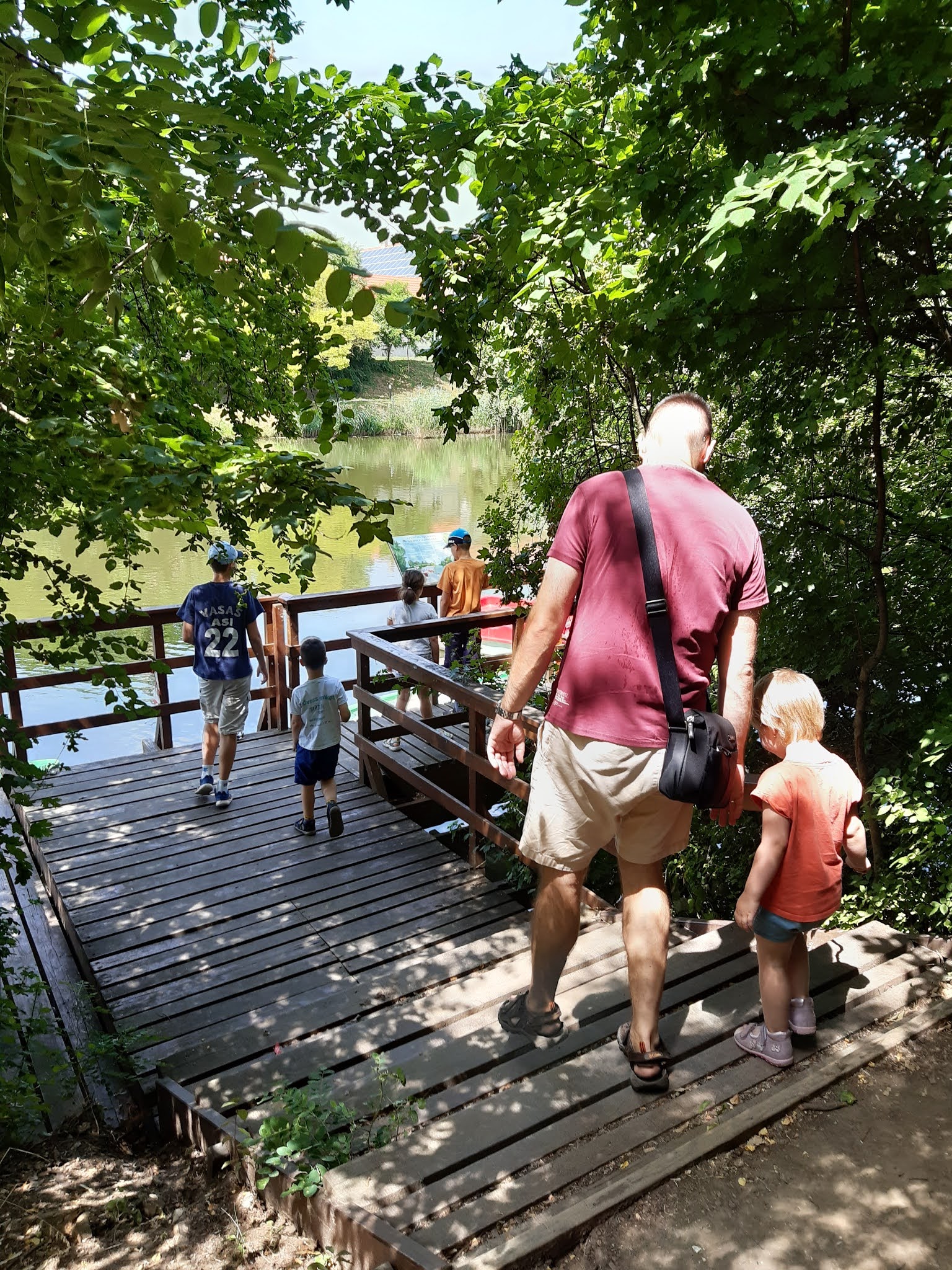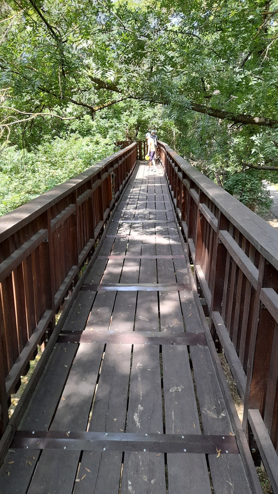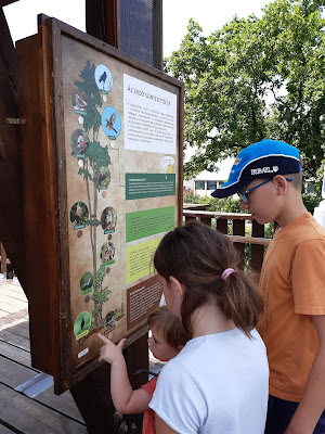 Az autót egy kicsi parkolóban hagyva elindultunk a parkba sétálni, láttunk szép játszóteret (nem csábultunk el), medencés strandot (nem próbáltuk ki), és mi csak mentünk, mentünk, mert céltudatosan a lombkoronasétányt kerestük. Hamar meglett, kiderült, fizetős, de nem vészesen drága. A bejárat a kilátó alján van (nyitvatartási időben érdemes érkezni!), itt kell fizetni a végtelenül kedves és türelmes, gyerekekhez szokott fiatal hölgynél, aki – mint utóbb rájöttem – a szúnyoginvázió miatt ül füstölők között a kis bódéban. Igen, itt sok lesz a szúnyog, erre lélekben készüljetek. Azért mégis csak egy holtág mellett található a tanösvény, hatalmas, árnyas fák között.