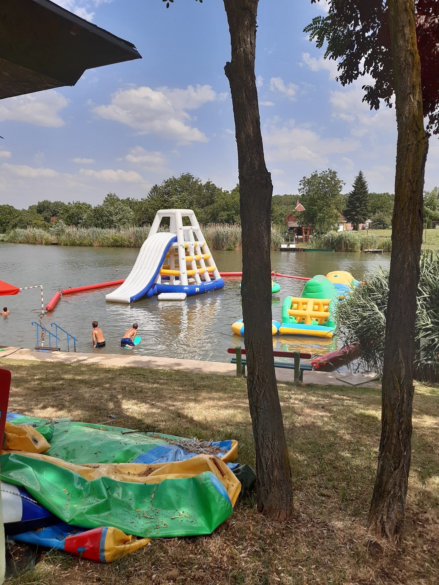 A Templom-zugi Pájer Kempinget és Strandot már jó ideje kinéztem magamnak, hogy szívesen kipróbálnám. Szerelmese vagyok a szabadvízi strandoknak! Nem csalódtam. Az egyszerű mosdók lehetnének itt is tisztábbak, de a víz, az ugráló stég, a nem túl nagy embertömeg (hétköznap jártunk itt) meggyőztek, hogy jó döntés volt ide jönni. A honlapon látható csúszdák elég rozoga állapotban vannak, és egy csúszás 100 Ft, úgyhogy ezt kihagytuk. A gyerekek megkapták jól megérdemelt jégkrémüket, majd néhány fürdőzés után viszonylag hamar elindultunk a szállás felé.