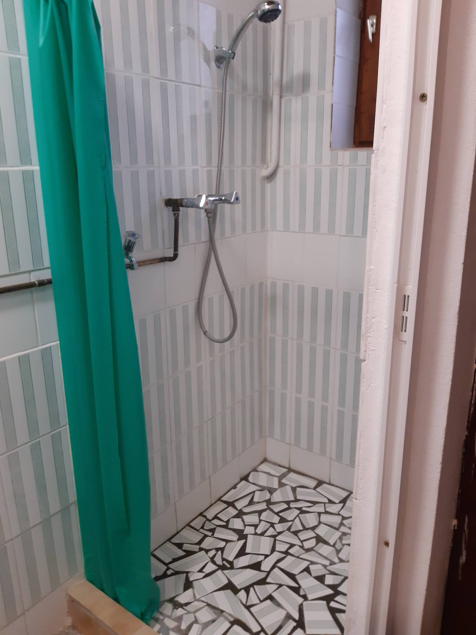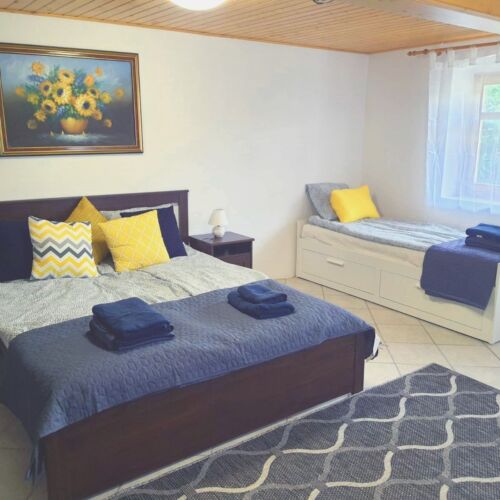 Judit nagyon jó ízléssel rendezte be a szobákat. Igyekezett szép, hasznos, ugyanakkor egymáshoz passzoló bútorokat választani, nekem nagyon bejön a falszín és az ágytakarók vidám kombinációja. A matracok nagyon kényelmesek, az ágynemű is kellemes tapintású. A törölközőkből minden személyre jutott egy nagy, egy közepes és egy kicsi. Hajszárító is van az egyik fürdőben. Ja igen, mert a hátsó házban kettő fürdő van, mindkét szobához egy.