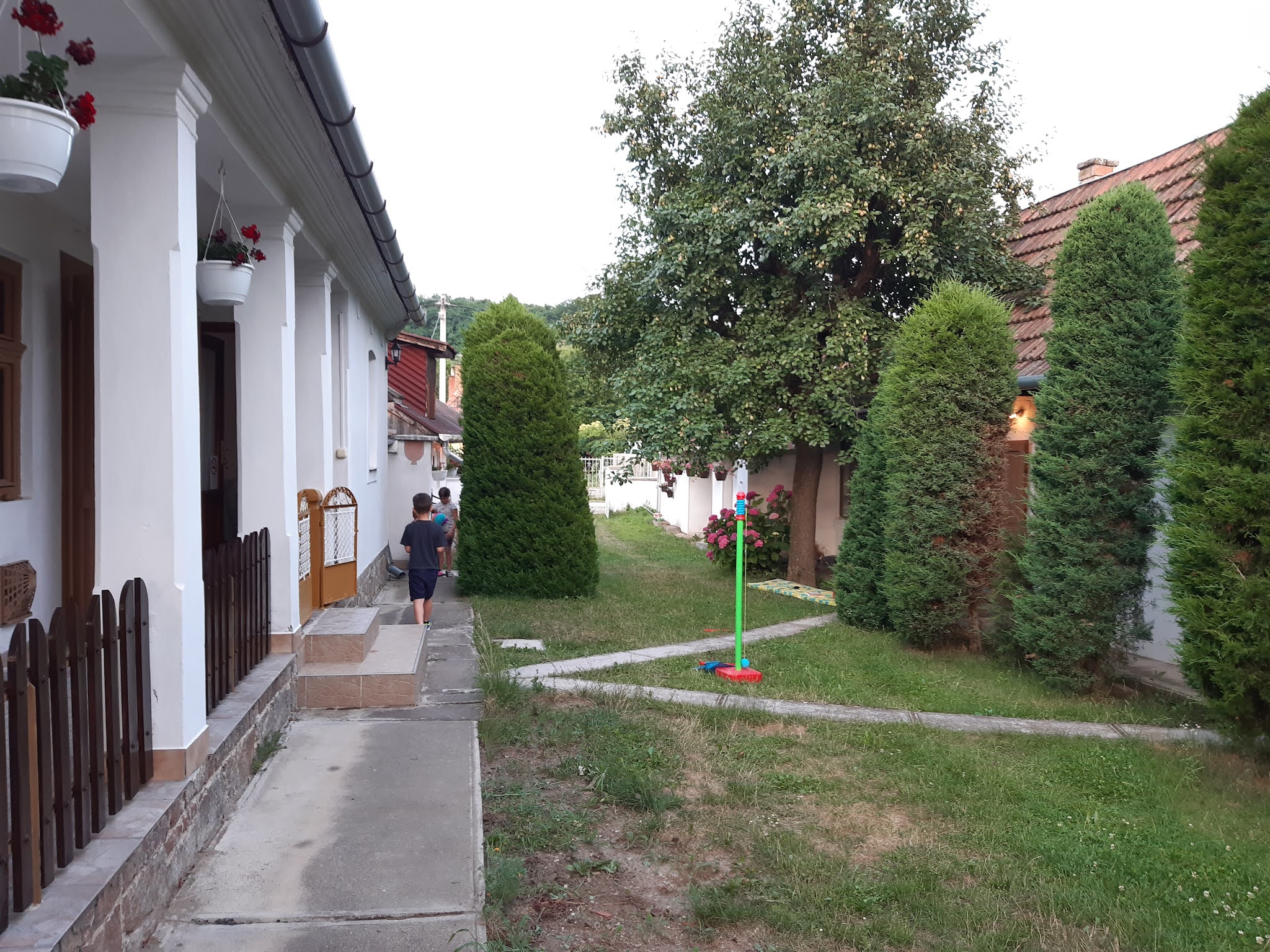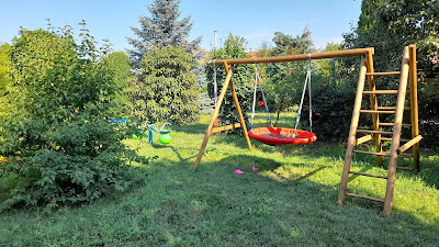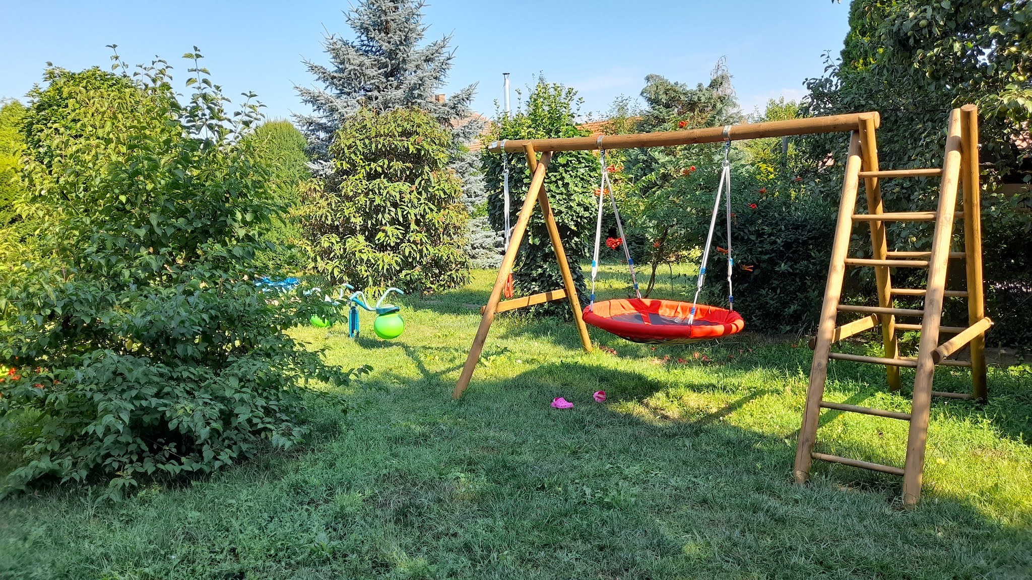 A kertről sem szabad megfeledkezni, a hátsó kert egy kis oázis a gyerekek számára. Van itt mérleghinta, csúszda, hinta, labda, homokozó, más játékok. Bence már első este felajánlott óvodásunknak egy bringát, bölcsisünknek egy futóbciklit, kisiskolásunknak egy rollert.