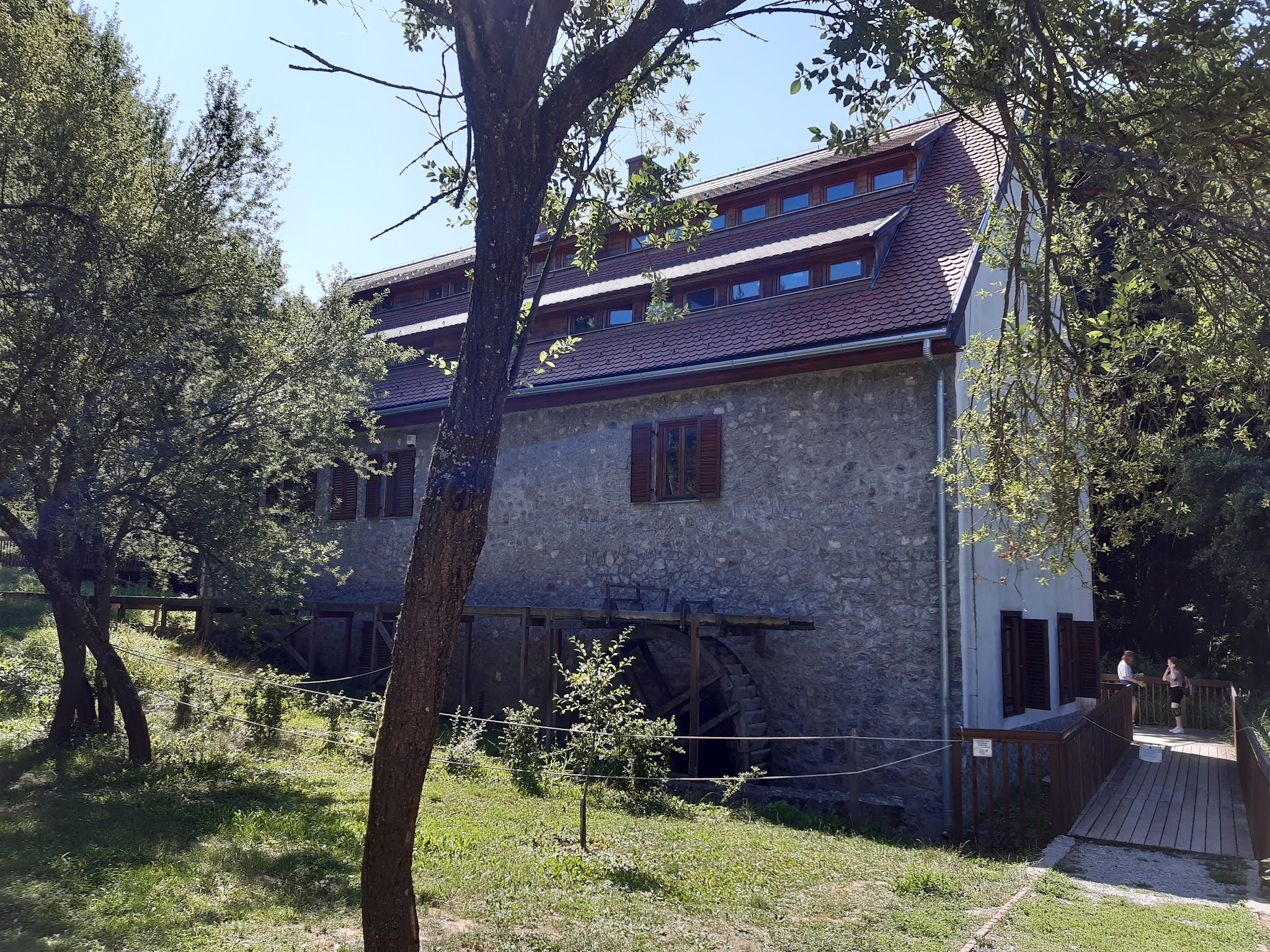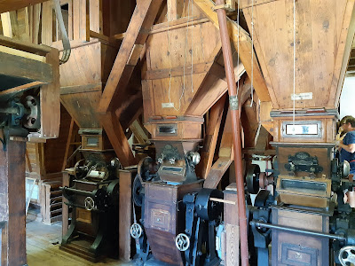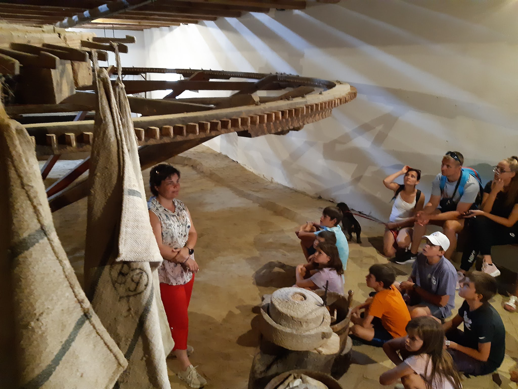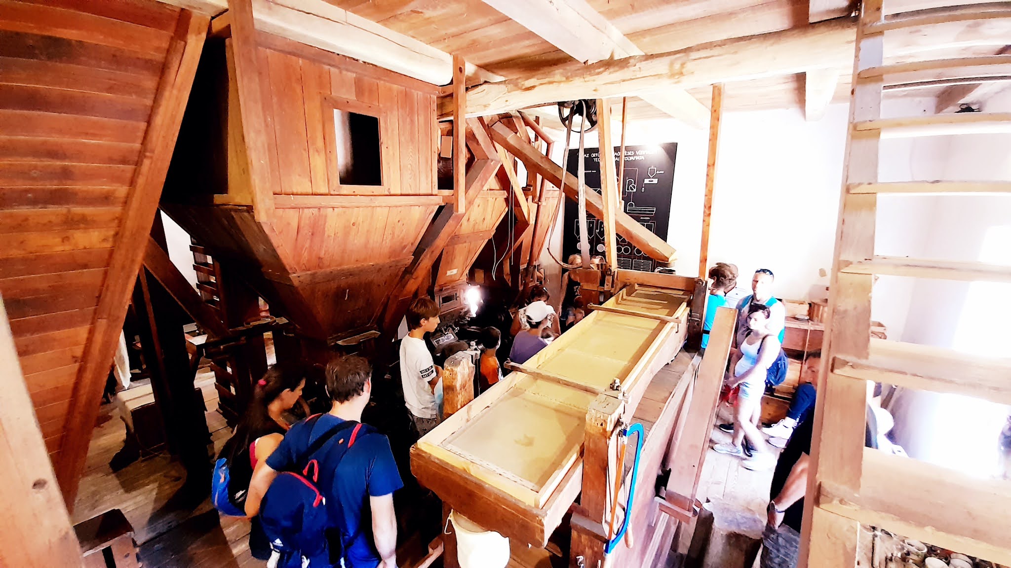 Idegenvezetőnk, Dalma nagy részletességgel mesélt nekünk a Mecsekről, a hegység vizeiről, és hogy miért pont itt lett egy malom – a vizimalom eredetileg is itt állt. A papírmalmot pályázati pénzből álmodták meg egy korábbi, létező malom mintája alapján, a szárazmalmot pedig tégláról téglára hozták ide egy Dombóvár melletti kis faluból, hogy mentsék a kulturális értéket, és mintegy skanzenszerűen mutathassák be itt Orfűn a molnár mesterséget.