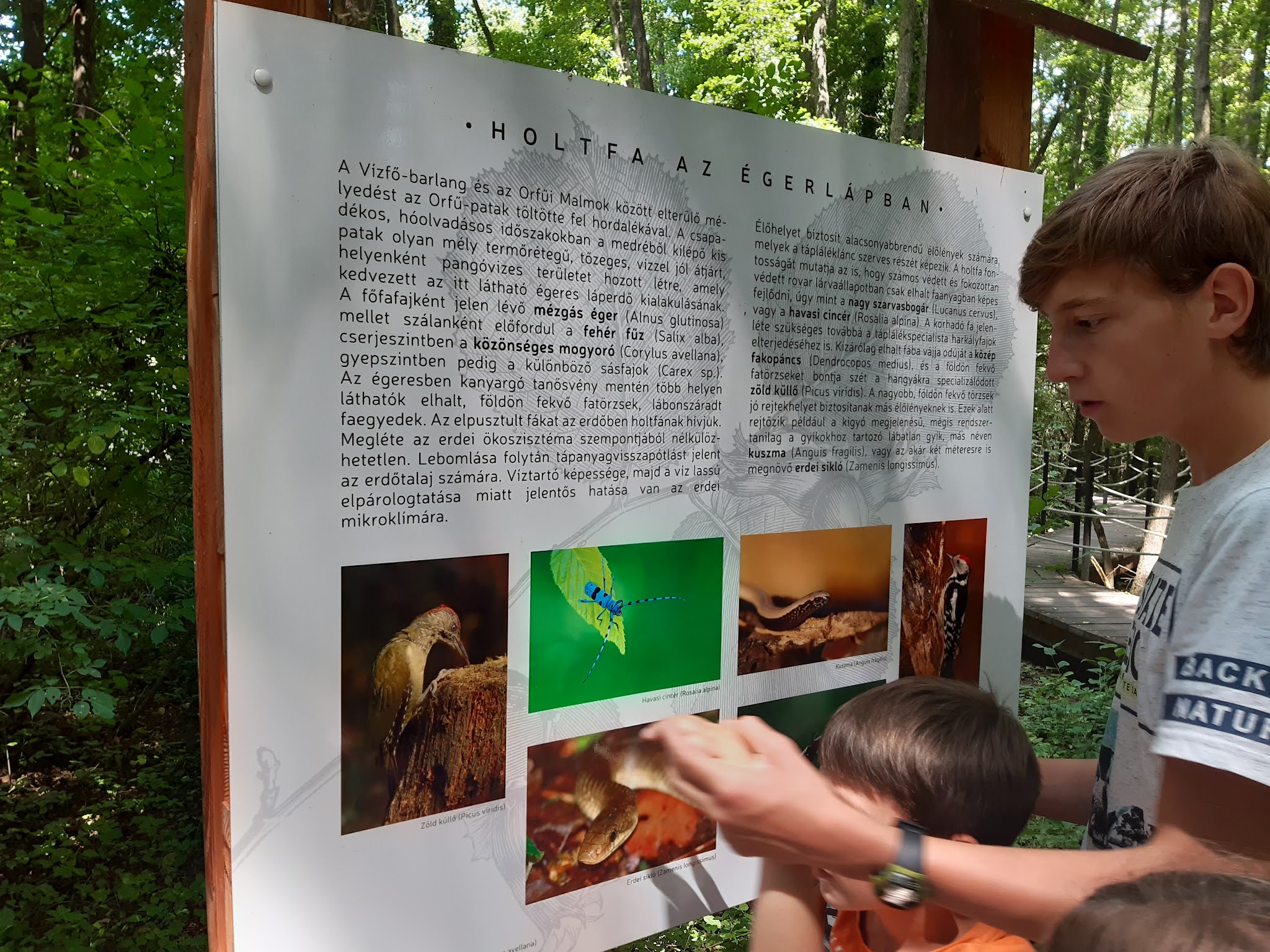 A tanösvényen emiatt mi visszafelé haladtunk (a Garat nevű kávézó mellett indul), de ez egyáltalán nem probléma. Égerláp, mézgás éger – ismerősek voltak a kifejezések, mégpedig innen: Ócsán jártunk hasonló körülmények között, igaz, ott nem volt pallósor. Hatalmas, szép szál égerfák jobbra, balra, előre, hátra – igazi mesebeli élmény volt itt sétálni.