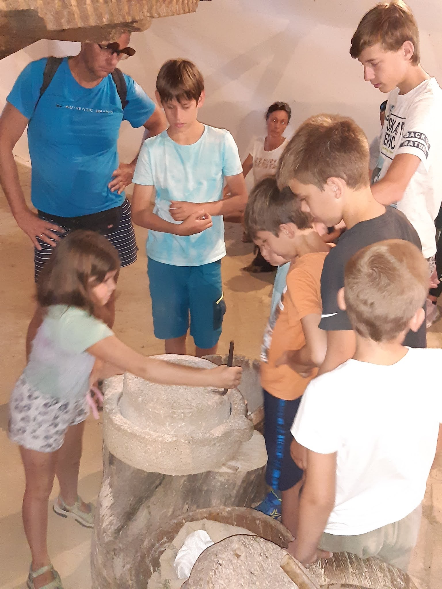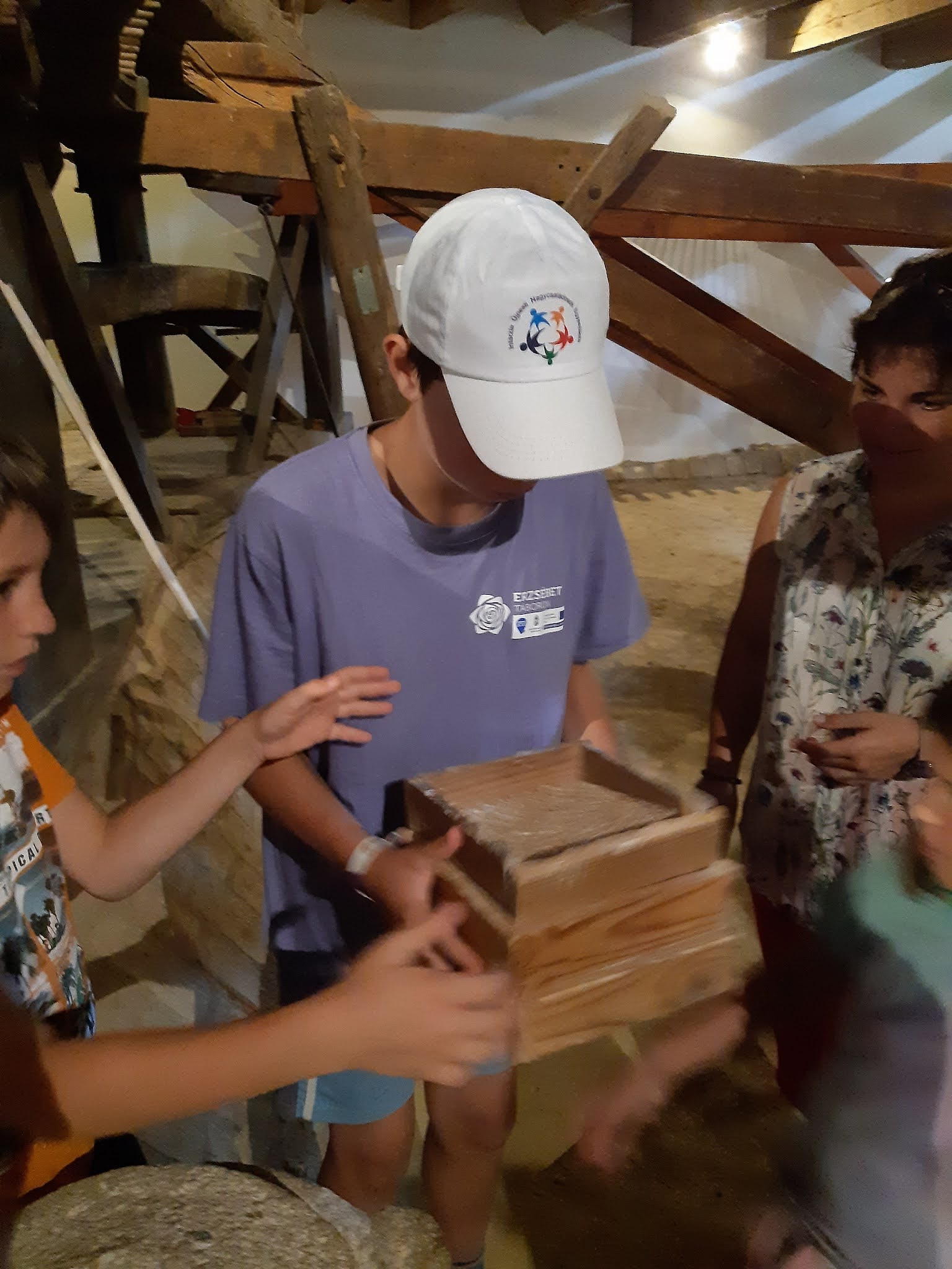 A vezetésen a malom működését nem csak szóban, de ténylegesen is kipróbálhatták a gyerekek. Hogy lesz a búzaszemekből liszt? Hogy lesz a dara? Kis kézimalom és kézi szita került elő, hogy megérthessék a gyerekek a folyamatot.