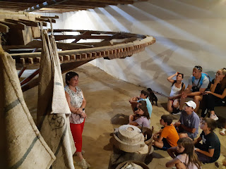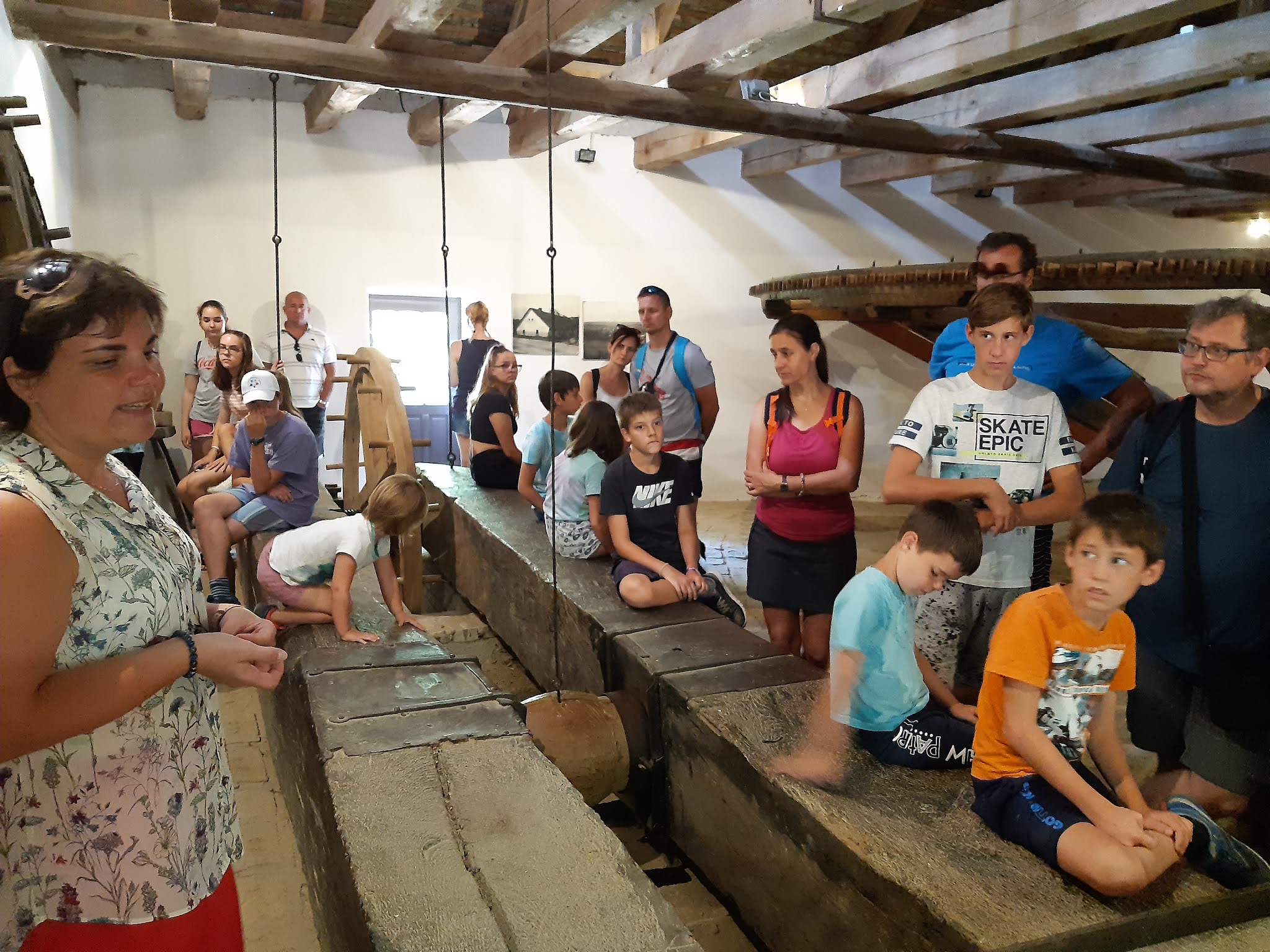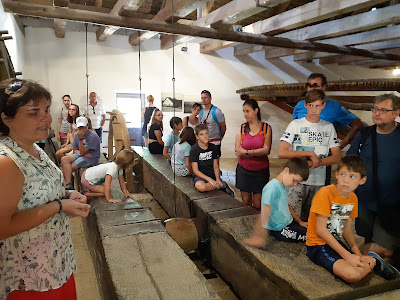 Hátul egy eredeti, több tonnát nyomó olajpréselő gép került bemutatásra. Dalma ezt is részletesen magyarázta el nekünk, mit hova tettek, mikor hogyan pörölték a magokat, melyik lépést melyik követte. A gyerekek itt is megmozdíthatták a hatalmas eszközt.
