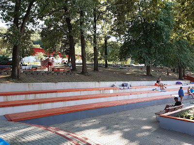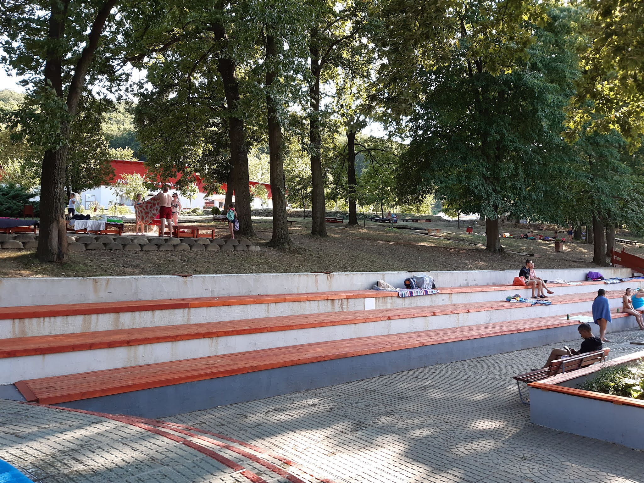 Számomra meglepően pozitív csalódás volt a Magyarhertelendi Fürdő. A különleges, teraszos elhelyezkedés miatt a kültéri strand nagy százaléka – különösen a medencék környékén – le van kövezve, ami kizárja, hogy kényelmesen lehessen füvön piknikezni. Ezt ismerte fel a fürdő, s ezért csaknem mindenkinek, aki belép (és nem a legdurvább hétvégi napokon érkezik) jut bőven fekvőhely. Ezek fa ágyak és/vagy székek, közvetlenül a medence környékén, vagy felette. A gyerekmedence mellett lépcsős-teraszos ülőkék is vannak, ahonnan, mint egy lelátóról megpihenve belátni az egész gyerekrészt.