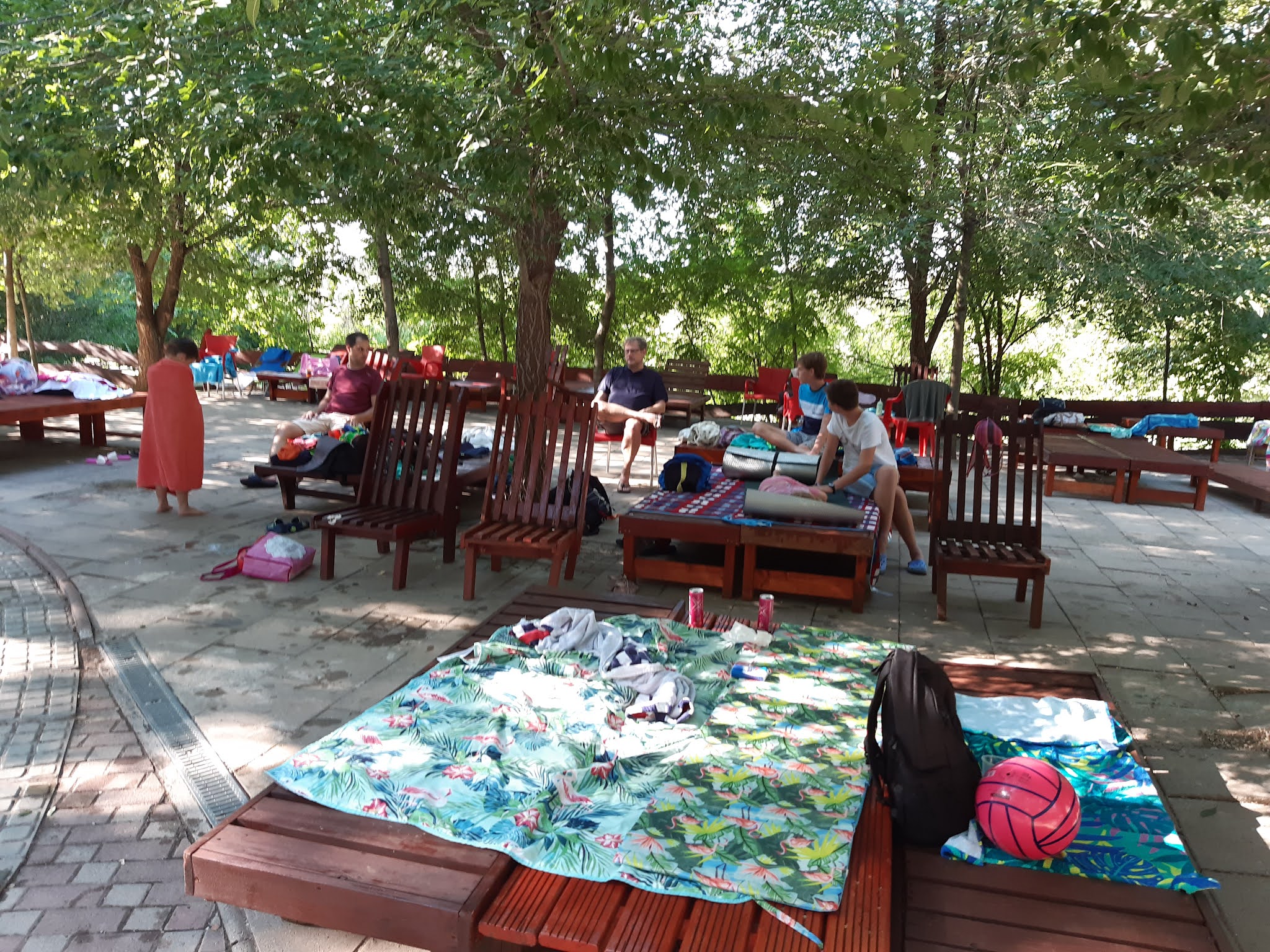 Viszont nagyon nagyon tetszett, és ezt családilag nem győztük dicsérni, hogy itt kültéren-beltéren egyaránt le lehet ülni. Gondoltak arra, hogy az ember nem egész nap a medencében áztatja magát, jó kijönni, jó, ha van a családnak egy saját bázisa, ahol ehet-ihat, pihenhet. Magyarhertenden ráadásul mindezt árnyékban tehettük.
