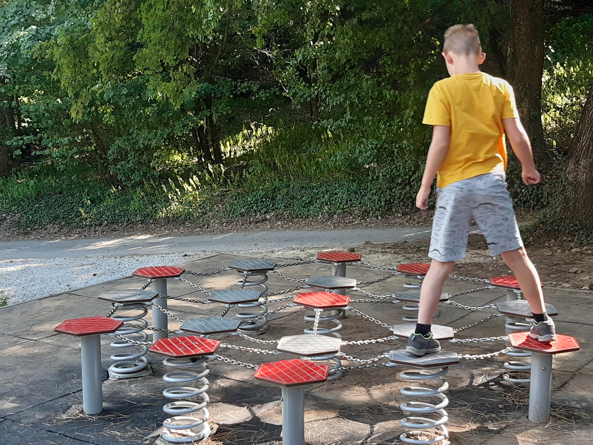 A kilátó magasan van, de a lépcső viszonylag kényelmes (bár nem sikerültek teljesen egyformára a fokok, ezen csodálkoztam…), és teljesen biztonságos kicsi gyerekeknek is. A korlát itt ugyanis – sok más kilátóval ellentétben – függőlegesen épült, nem lehet rámászni, sőt, nemhogy egy gyerekfej, de egy gyerekkar sem fér ki a hézagok között. Pirospont, ötös, taps. 🙂