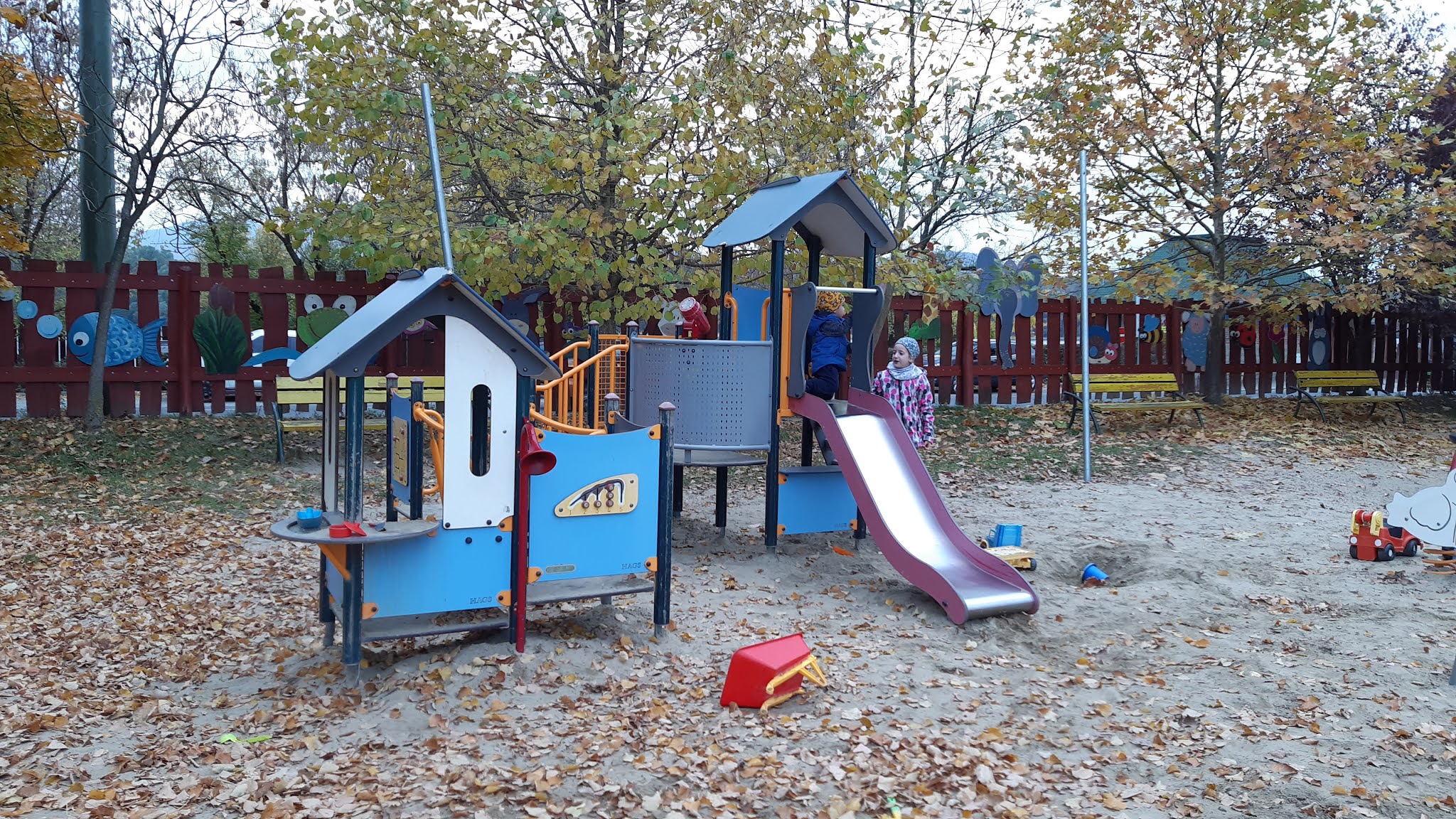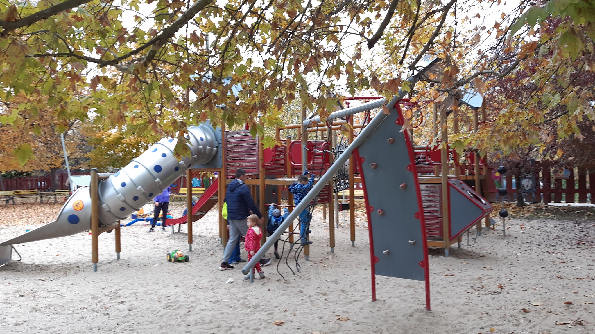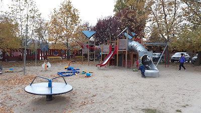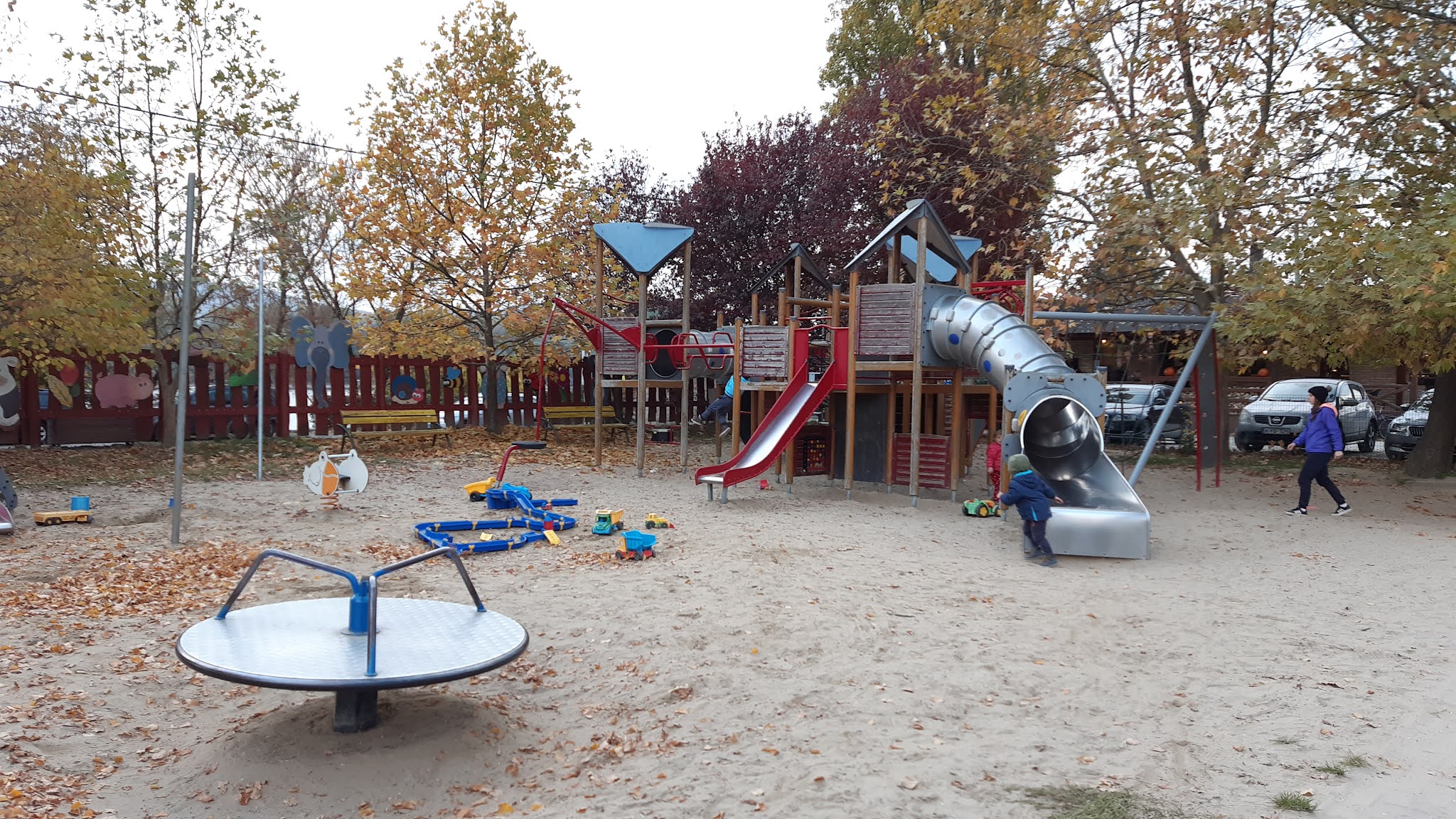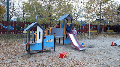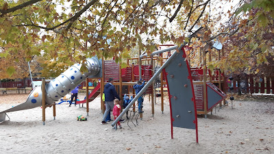 A cukrászdánál eszünkbe jutott, hogy az út túloldalán található játszóteret ki sem próbáltuk, uccu neki, menjünk át!