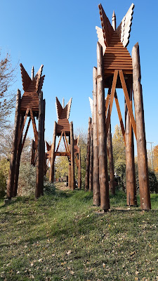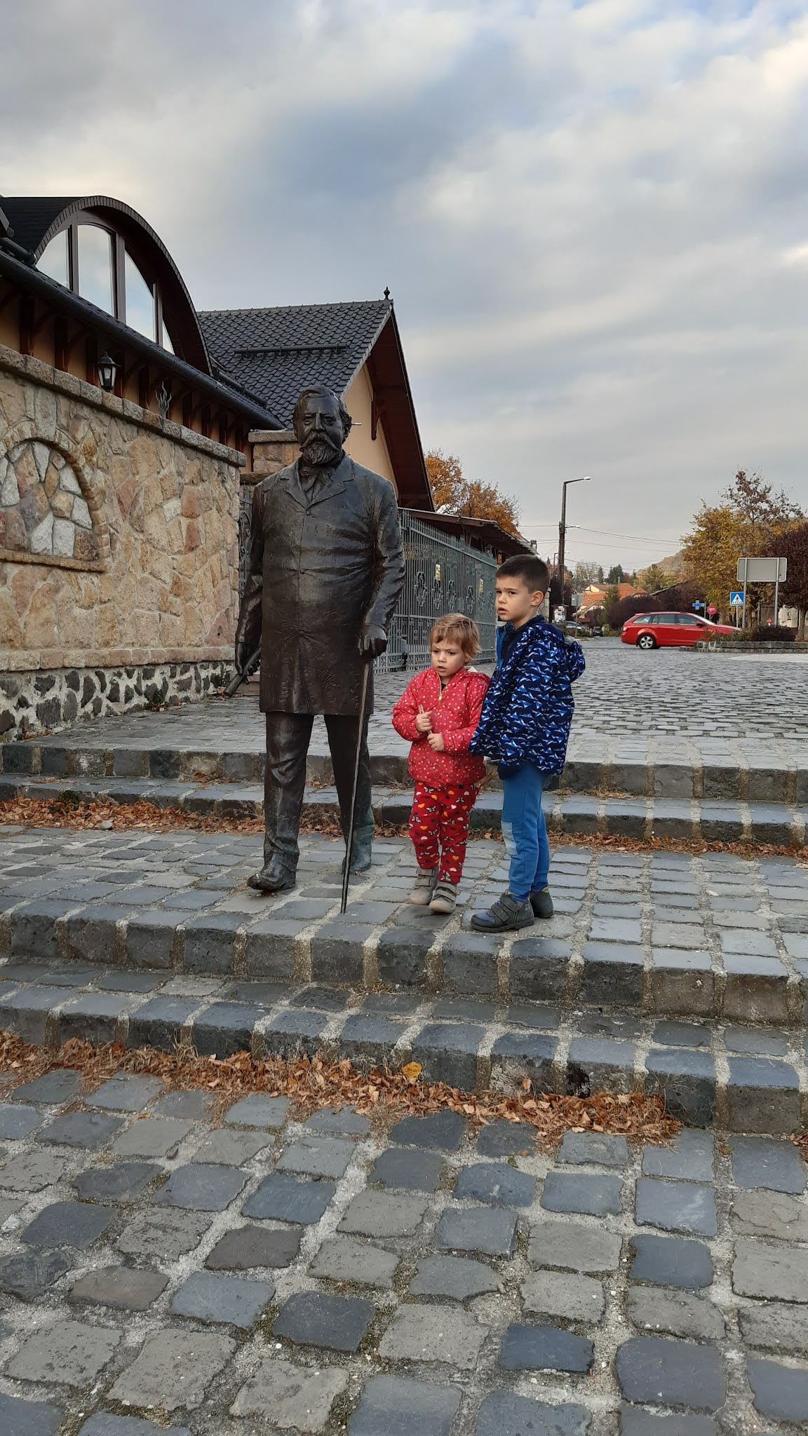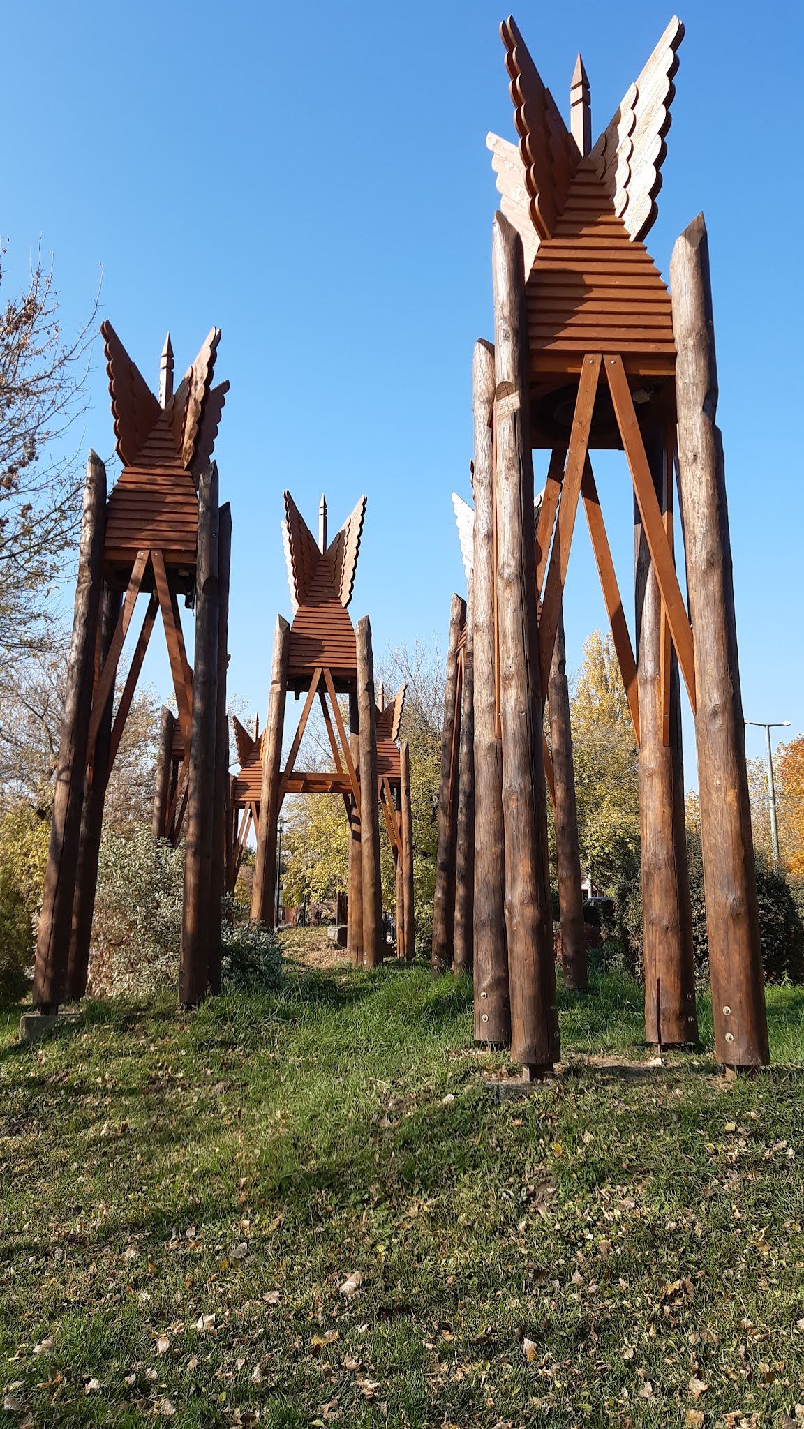 Csodálatos néhány órát töltöttünk a kis település szélén, a fenti “gondok” ellenére. Ugyanis itt minden van, egyrakáson, ami egy kisgyerekes szülőpárnak igazi hétvégi kikapcsolódás. Az autónkat A Hét Vezér harangja mellett hagytuk, közvetlenül a 12-es út mentén található parkolóhelyek egyikén. A parkolásért nem kellett fizetnünk. A Haranglábakat Makovecz Imre tervezte, 2000-ben a Millennium évében a Hősök terén voltak kiállítva, majd ide kerültek Verőcére, a kezdetekkor csak kölcsönbe, ám itt maradtak. Ma már a település egyik védjegye a hét minden napján más dallamot játszó hét harangláb.